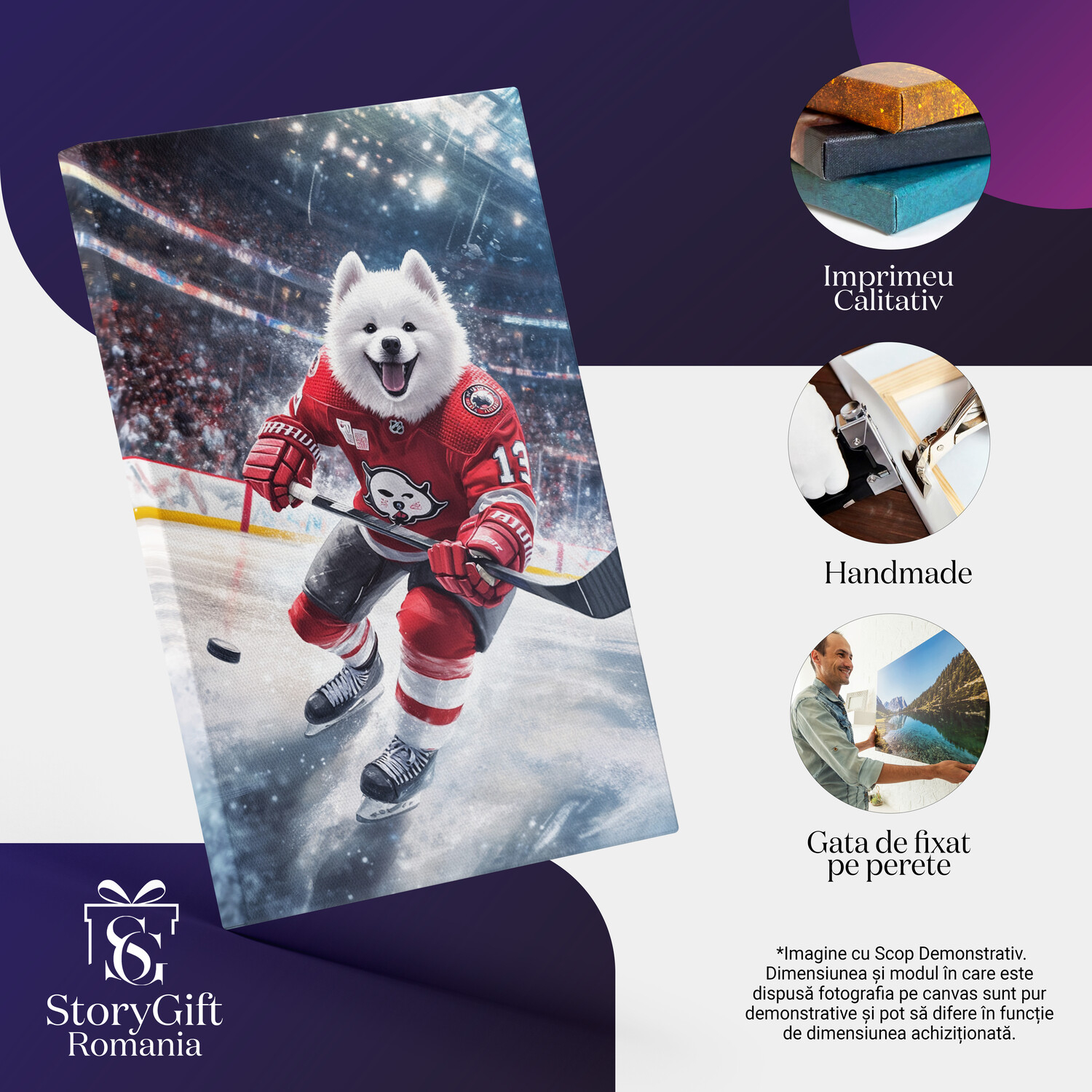 Tablou Canvas Personalizat Jucator de hochei cu viteza pe gheata in timpul meciului, echipament rosu cu numar si embleme, sport de iarna pe gheata 40x25CM