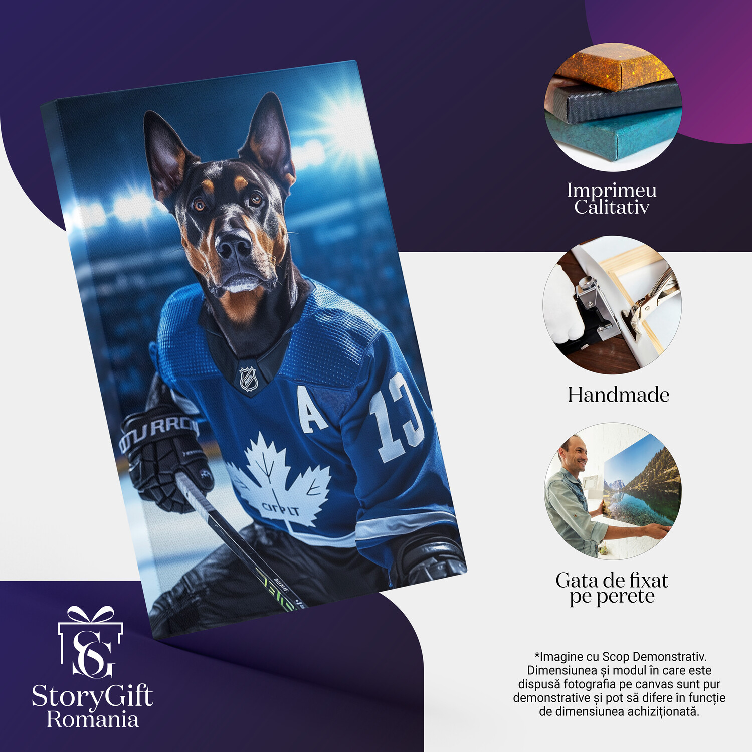 Tablou Canvas Personalizat Jucator de hochei in timpul meciului, echipament albastru cu numar si embleme, sport de iarna pe gheata 70x50CM