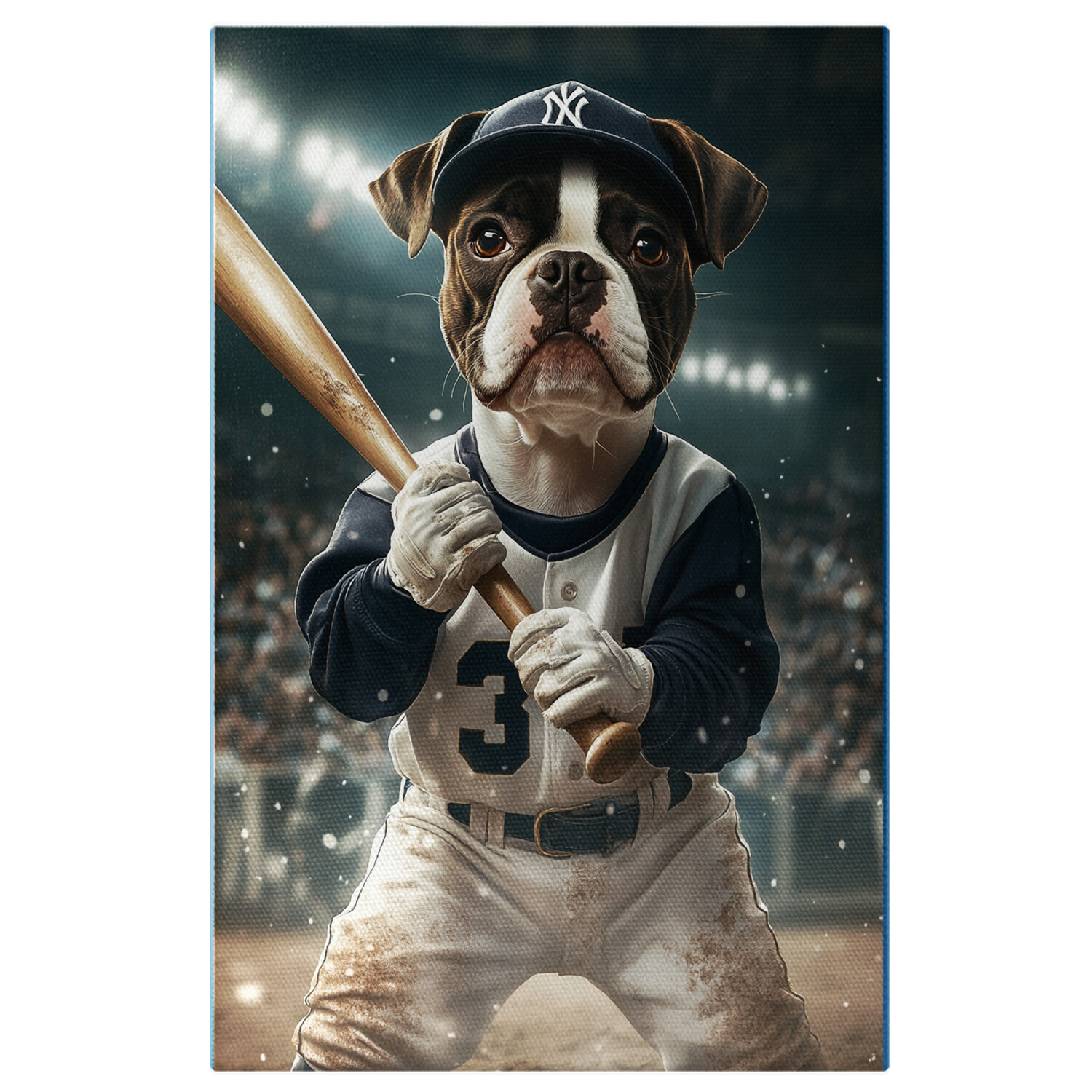 Tablou Canvas Personalizat Portret Jucator de Basebal pe teren in timpul meciului, Uniforma cu numar albastru, sapca, bata de lemn 120x80CM