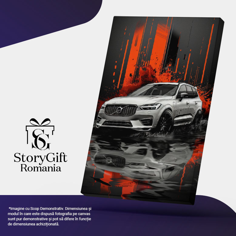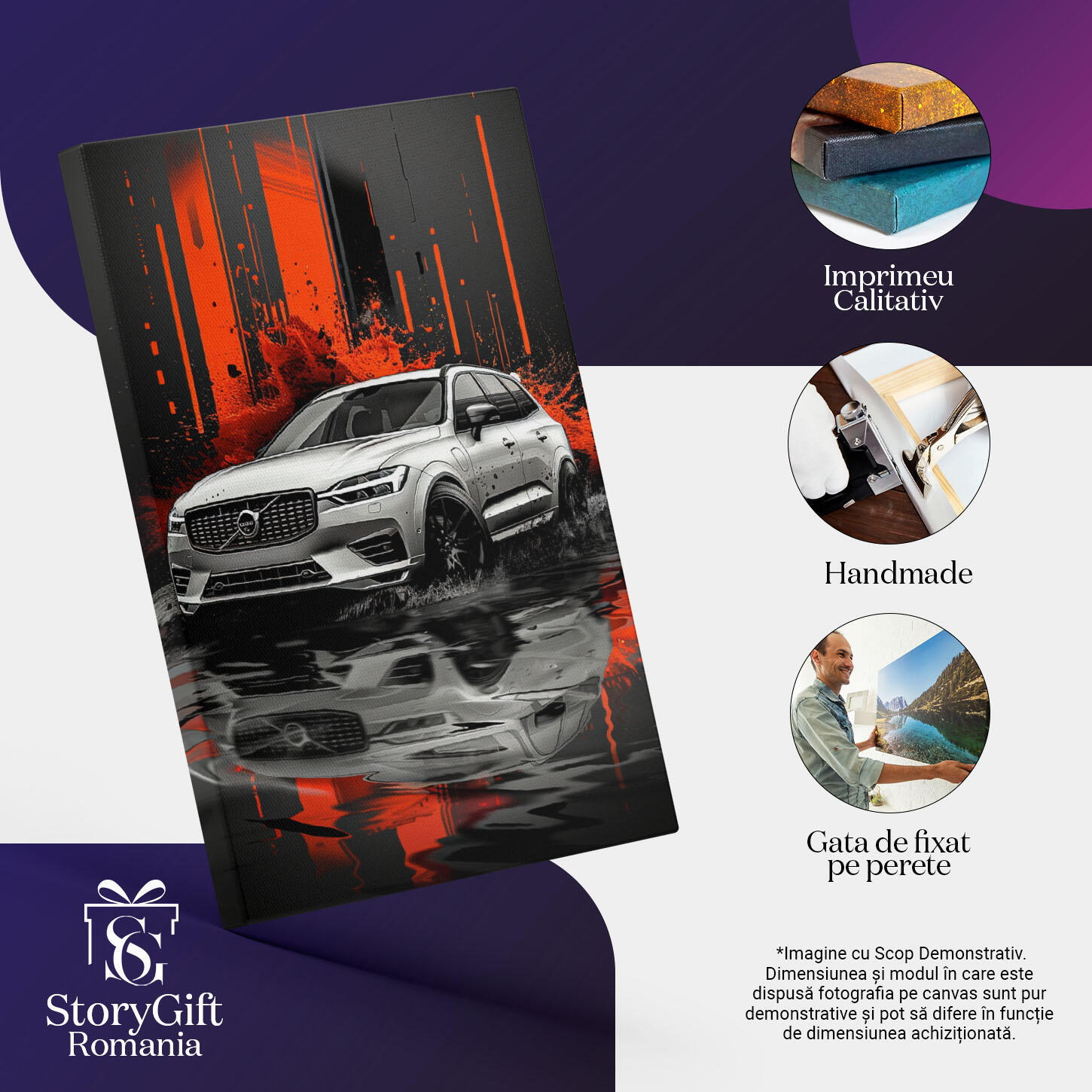 Tablou Canvas White Car, Masina Volvo de Culoare Alba pe o Podea in care se Reflecta cu un Decor Rosu-Negru in Spate , Pictura Digitala 40x25CM