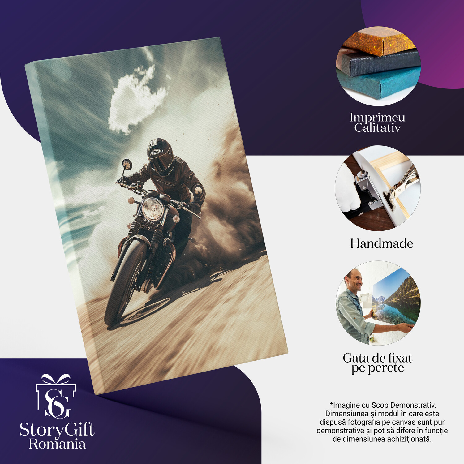 Tablou Canvas Barbat care Conduce o Motocicleta facand Drifturi in Nisip lasand Mult Praf in Urma lui , Pictura Digitala - Tablou Canvas Signature de la StoryGift Romania