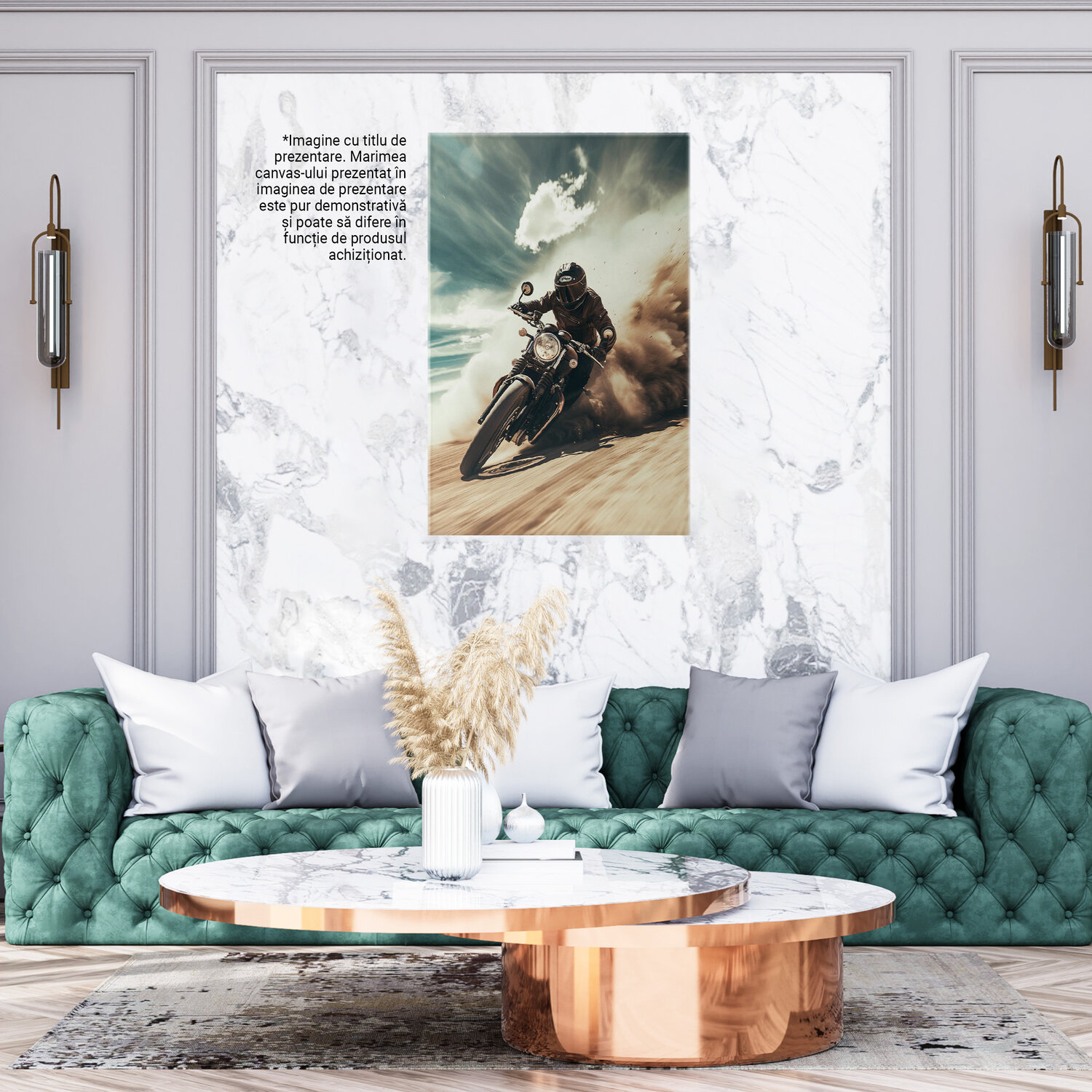 Tablou Canvas Barbat care Conduce o Motocicleta facand Drifturi in Nisip lasand Mult Praf in Urma lui , Pictura Digitala 40x25CM