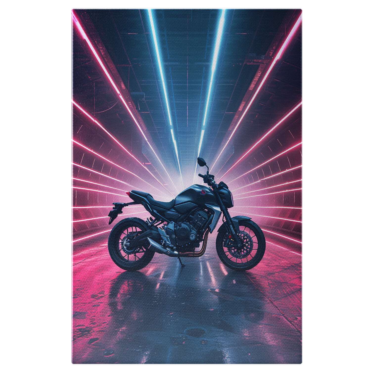 Tablou Canvas Camera cu Lumini Roz in care sta Motocicleta Neagra, Garajul unui Pasionat de Motociclete , Pictura Digitala 40x25CM