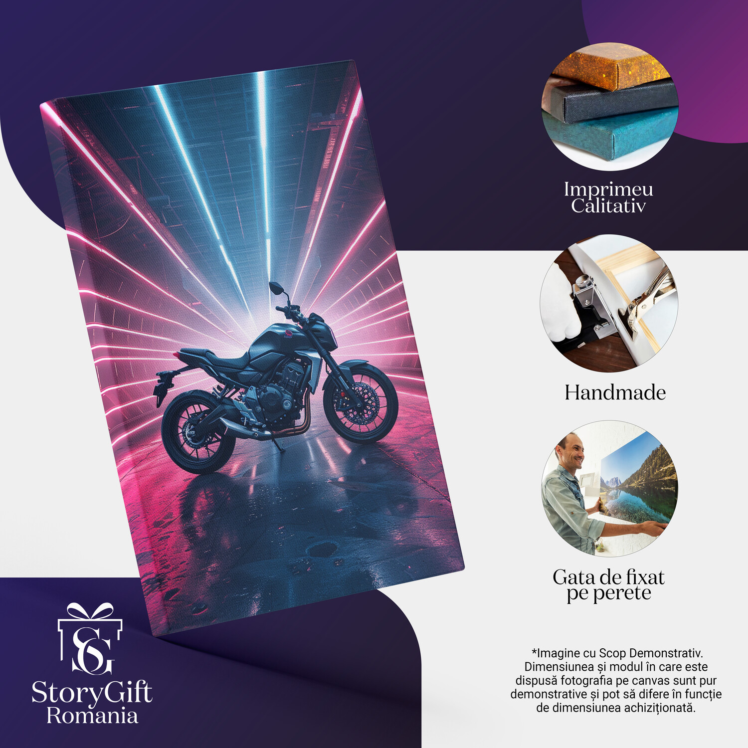 Tablou Canvas Camera cu Lumini Roz in care sta Motocicleta Neagra, Garajul unui Pasionat de Motociclete , Pictura Digitala - Tablou Canvas Signature de la StoryGift Romania