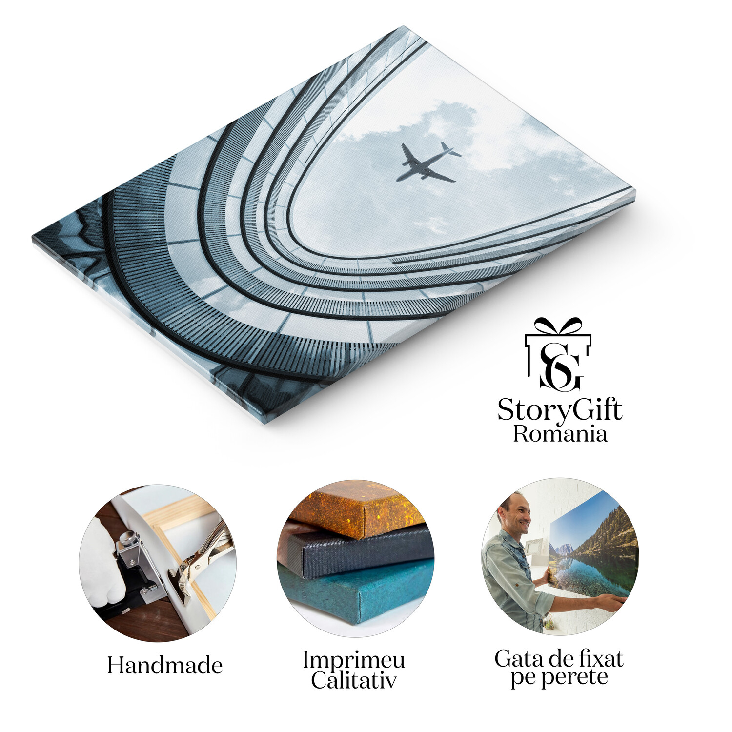 Tablou Canvas Cladire Moderna cu Avion Aterizand Arhitectura, Avion, Calatorie, Constructie, Urban - Tablou Canvas Signature de la StoryGift Romania