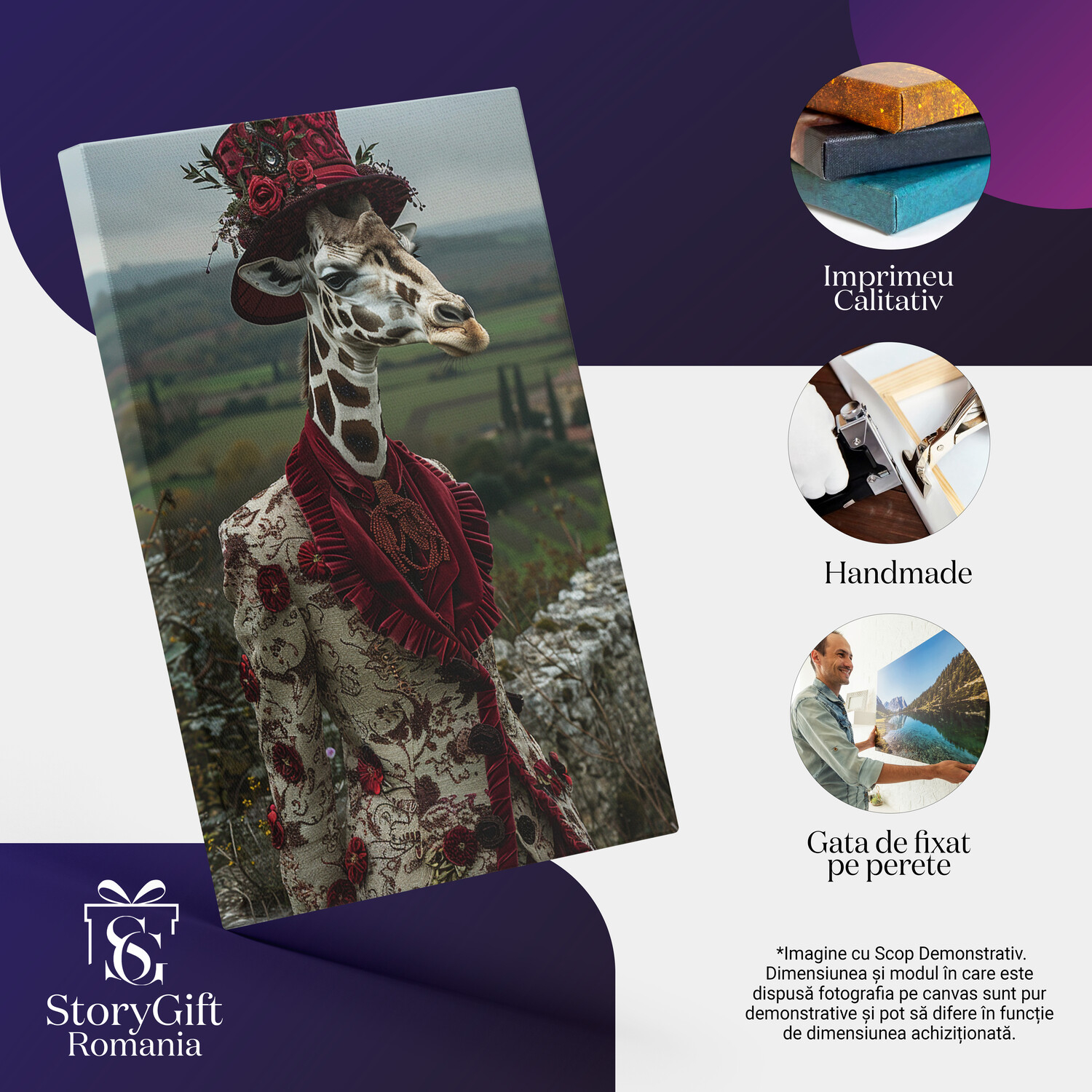 Tablou Canvas Costum elegant cu catifea si model floral pe corpul girafei- Gat lung si palarie cu trandafiri , Pictura Digitala - Tablou Canvas Signature de la StoryGift Romania