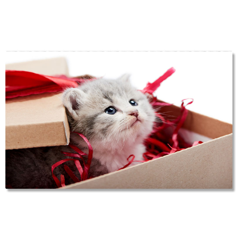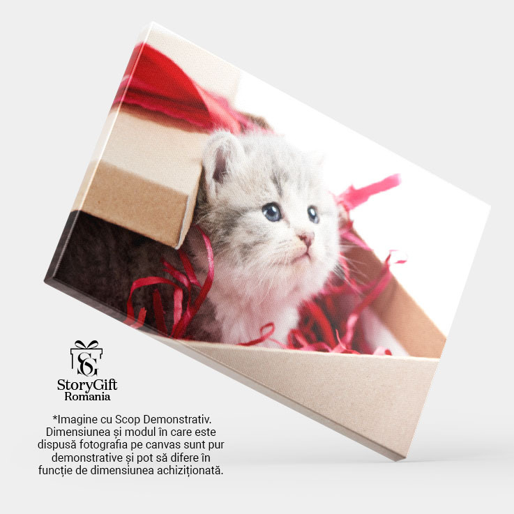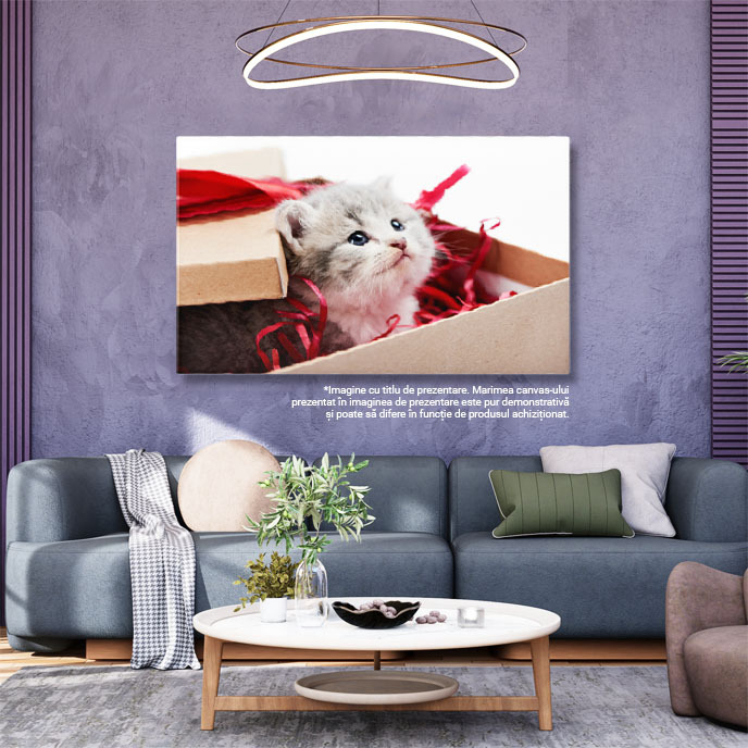 Tablou Canvas Pisicuta Gri Curioasa Privind de Pe Masa de Decoratii, Pisica, Draguta, Jucarie, Pufos 2795 40x25CM