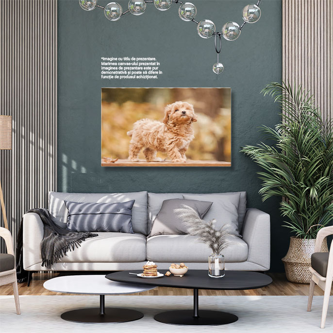 Tablou canvas cu pui de catel, poodle, toamna, banca de lemn, frunze, multicolor 40x25CM