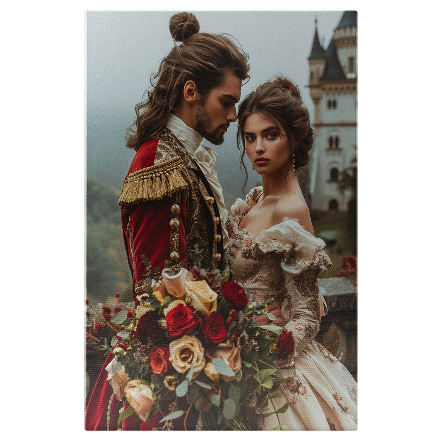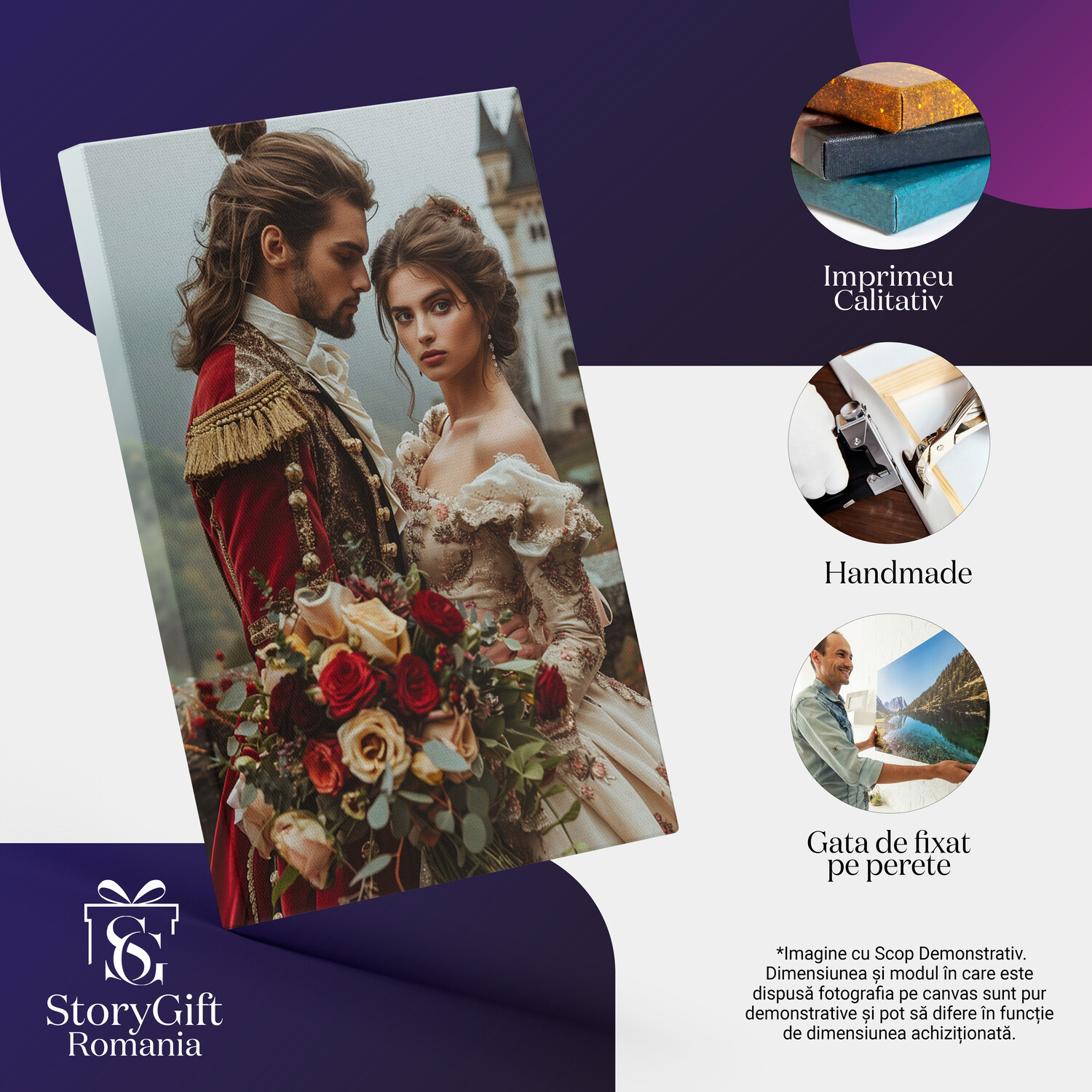 Tablou Canvas: Cuplul Medieval Fata in Rochie Alba cu Cercei Lungi ai Buchet de Flori si Printul Fermecator Pictura Digitala - Tablou Canvas Signature de la StoryGift Romania