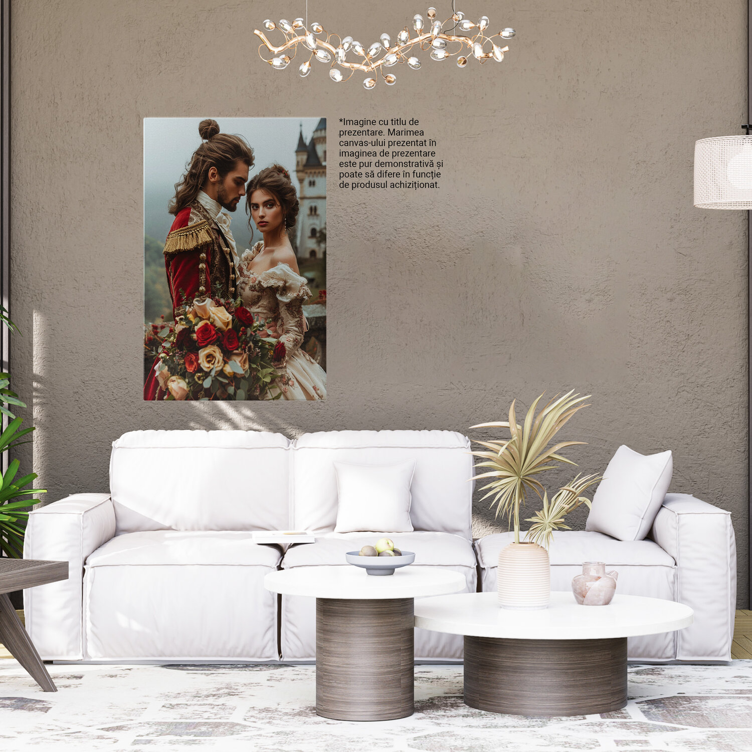 Tablou Canvas: Cuplul Medieval Fata in Rochie Alba cu Cercei Lungi ai Buchet de Flori si Printul Fermecator Pictura Digitala 40x25CM