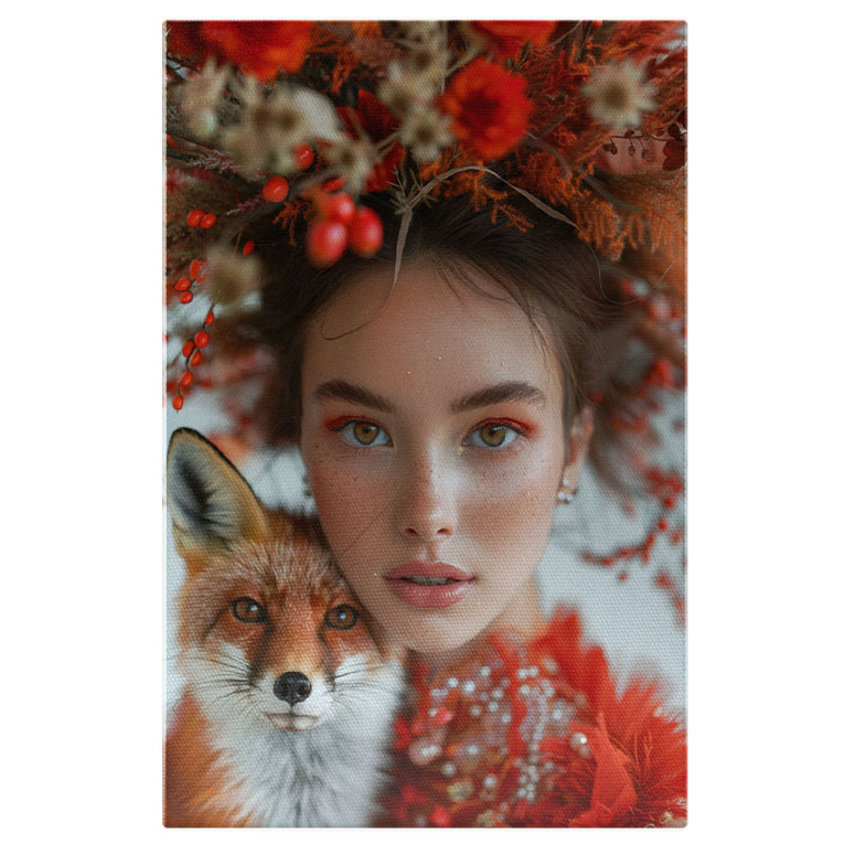 Tablou Canvas Dama Incantatoare si o Vulpe cu Privire Curioasa, cu Ochii Senini si Pistrui in Rochie Rosie cu Cercei , Pictura Digitala 40x25CM