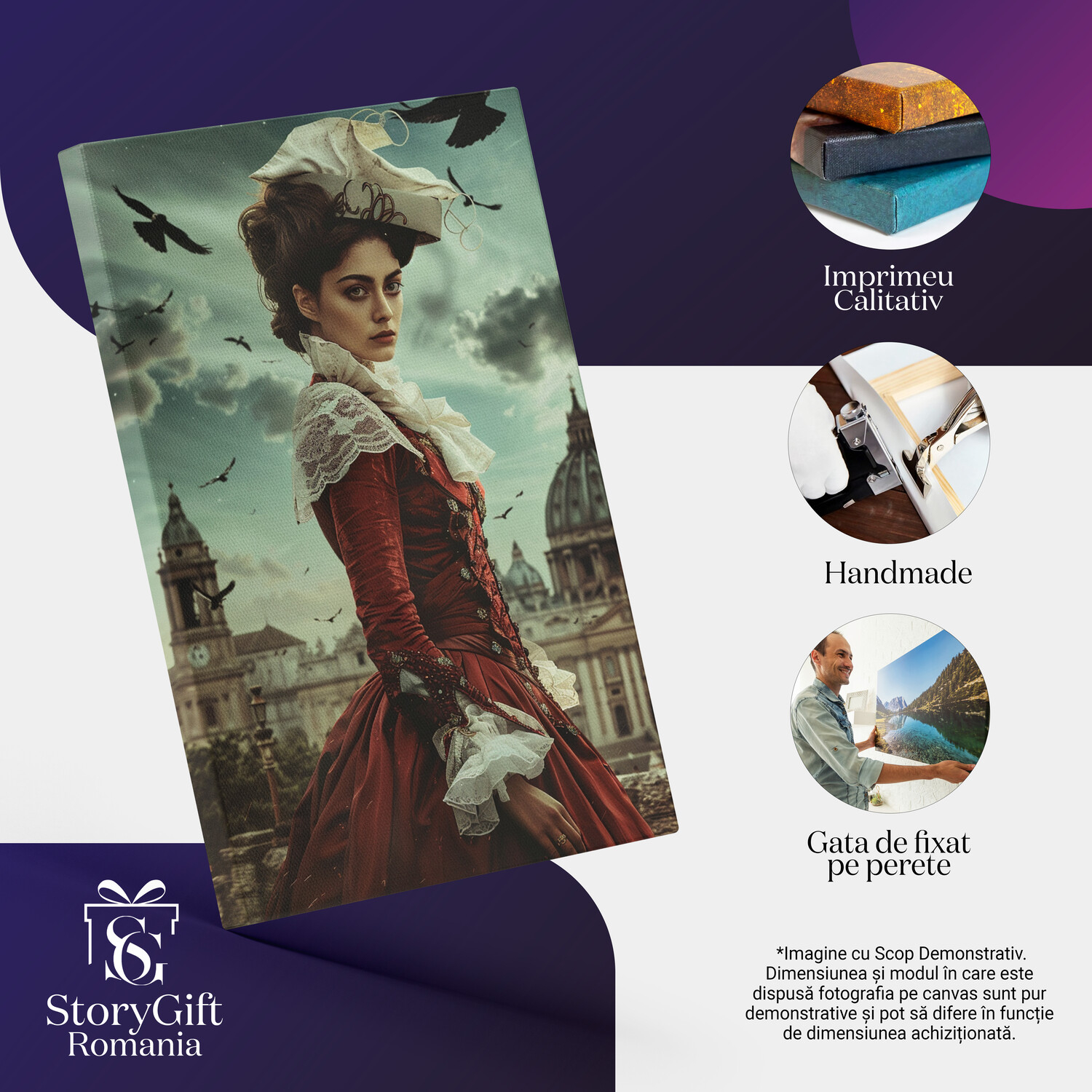 Tablou Canvas Doamna in rochie rosie de epoca in mijlocul orasului- Pasari in zbor , palarie alba , Pictura Digitala - Tablou Canvas Signature de la StoryGift Romania