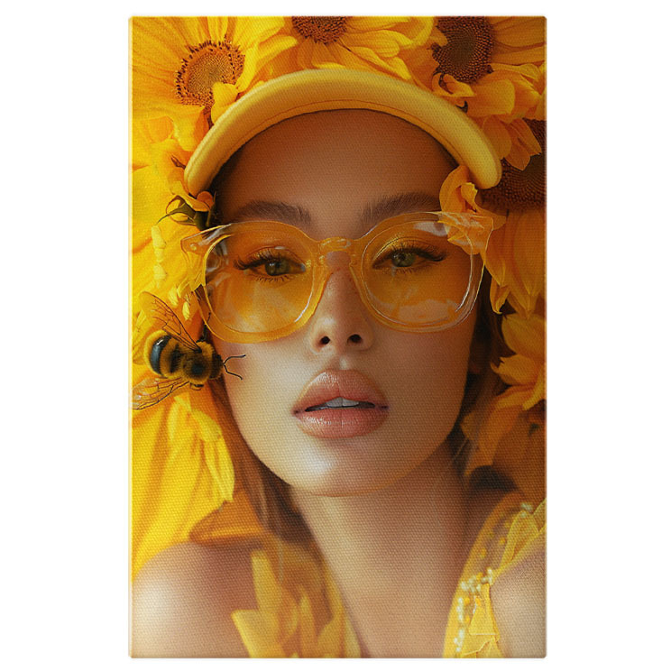 Tablou Canvas The Bee Girl cu Ochelari si Sapca cu Flori Galbene in Rochita cu Gene Lungi si O Albina langa ea , Pictura Digitala 40x25CM