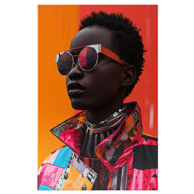 Tablou Canvas Femeie Negresa cu Ochelari si Buze Mari cu Parul Cret Scurt in Jacheta Colorata cu Nasturi , Pictura Digitala 40x25CM