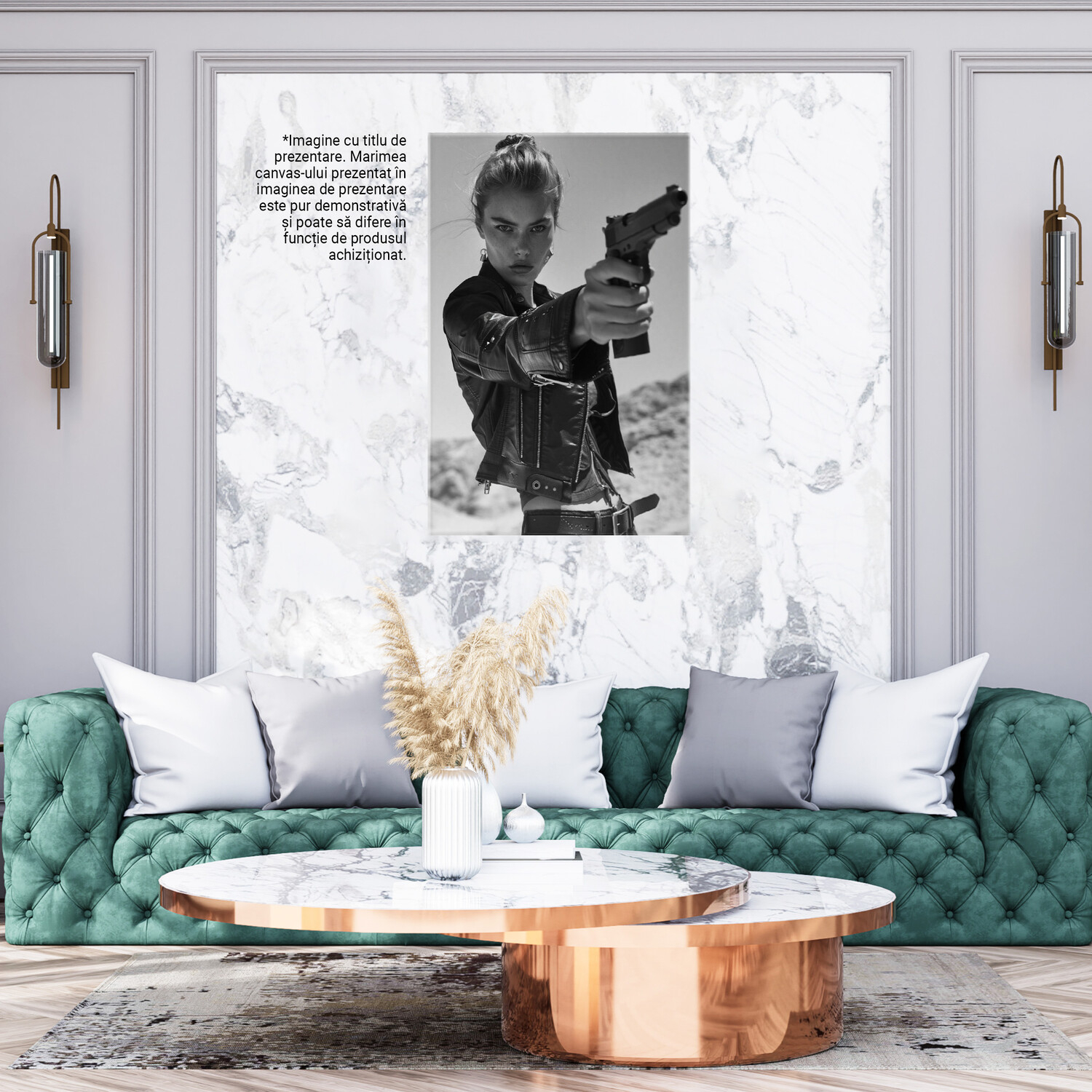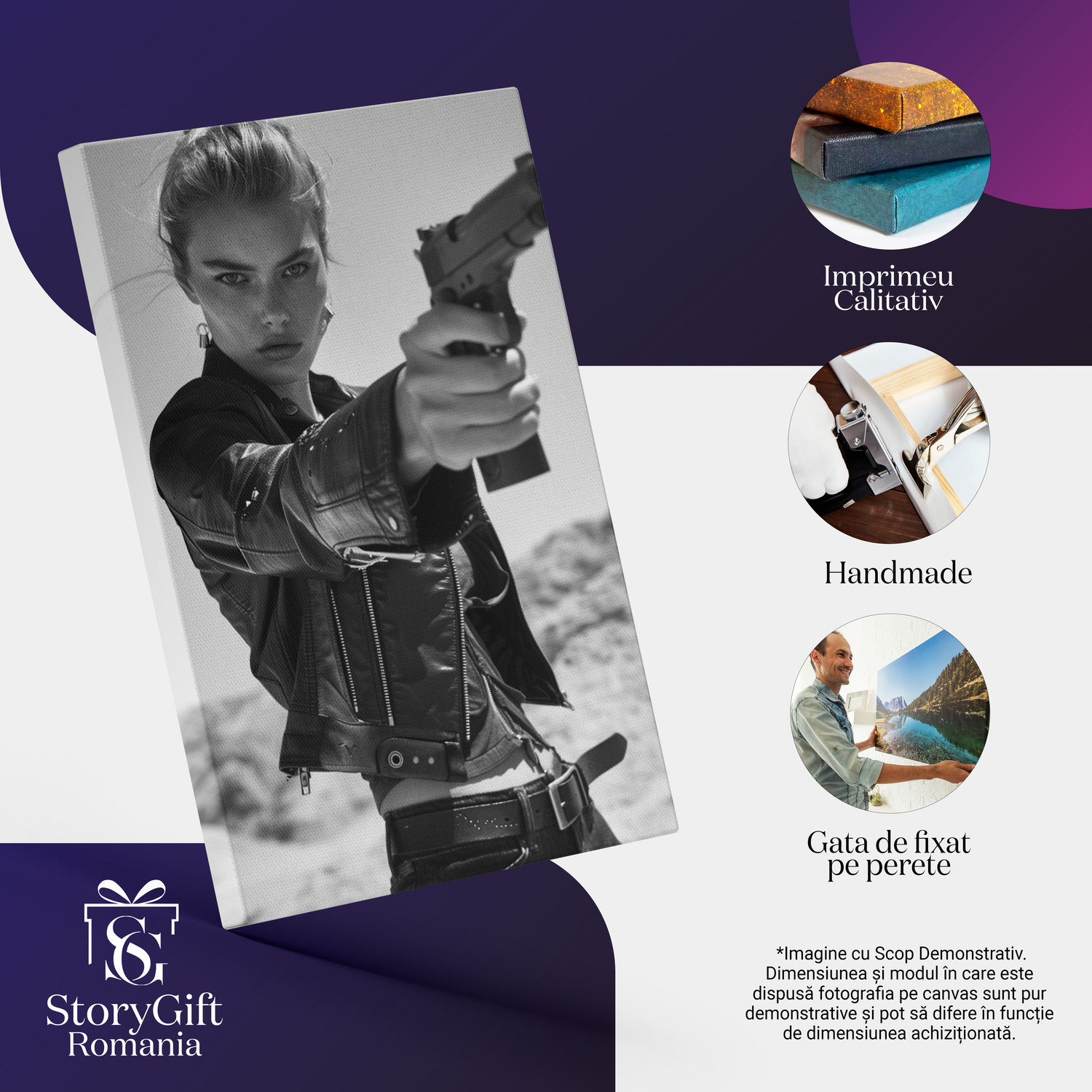 Tablou Canvas Femeie Pericuolasa si Furioasa in Jacheta de Piele si Blugi cu Pistrui care tine un Pistol in Mana , Pictura Digitala - Tablou Canvas Signature de la StoryGift Romania