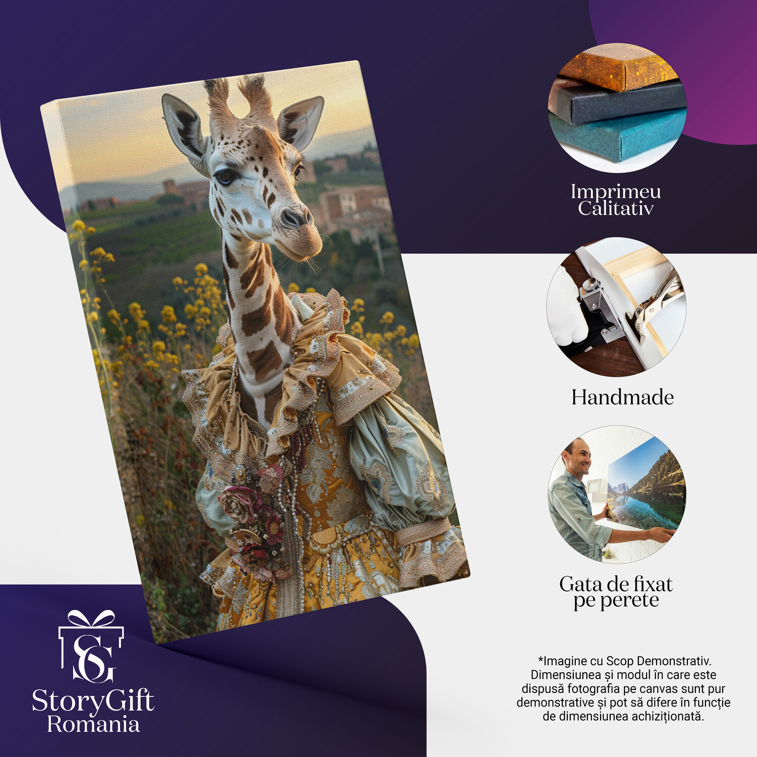 Tablou Canvas Girafa Tanara in Rochie Medievala in Campul cu Floricele Salbatice unde e Liniste si Pustietate , Pictura Digitala - Tablou Canvas Signature de la StoryGift Romania