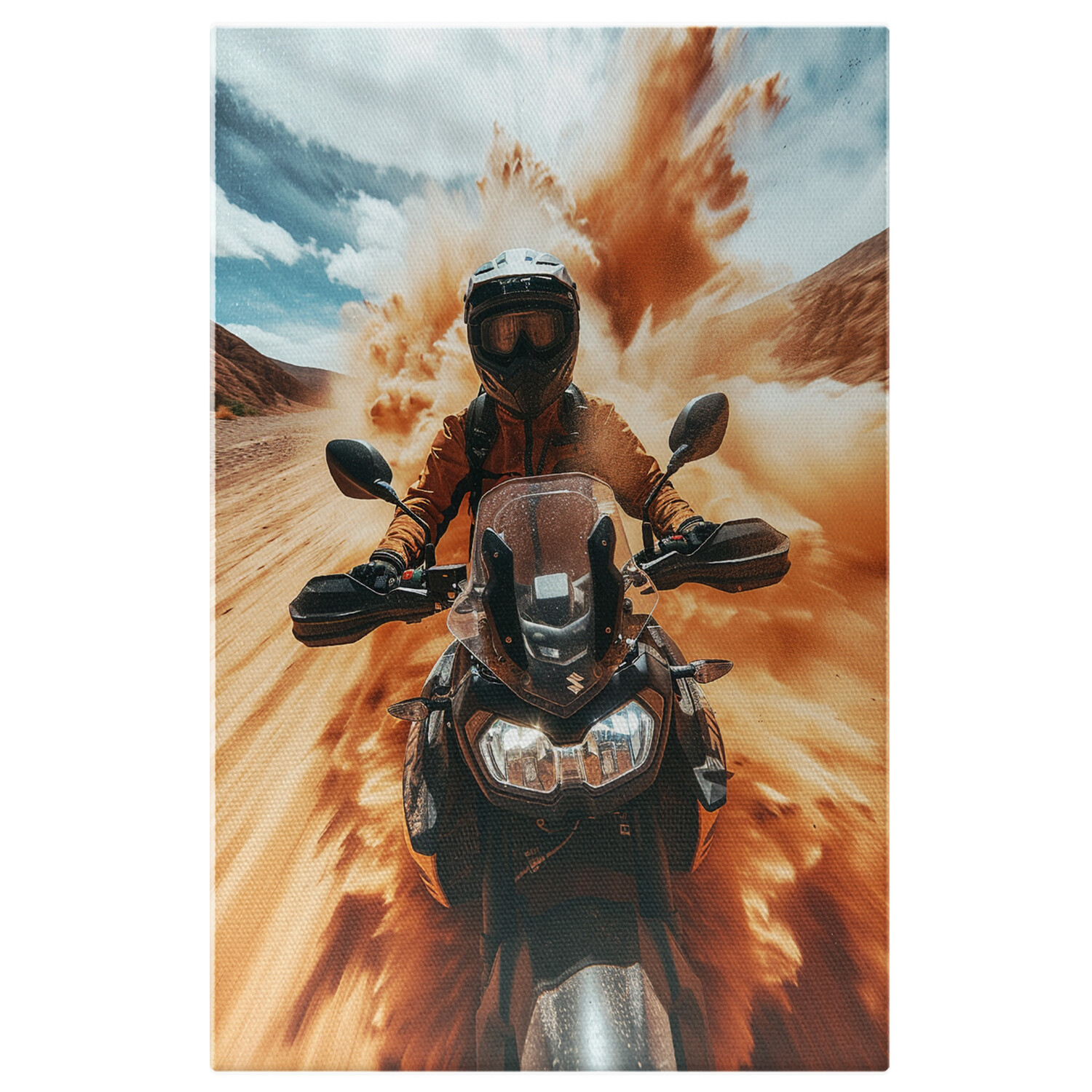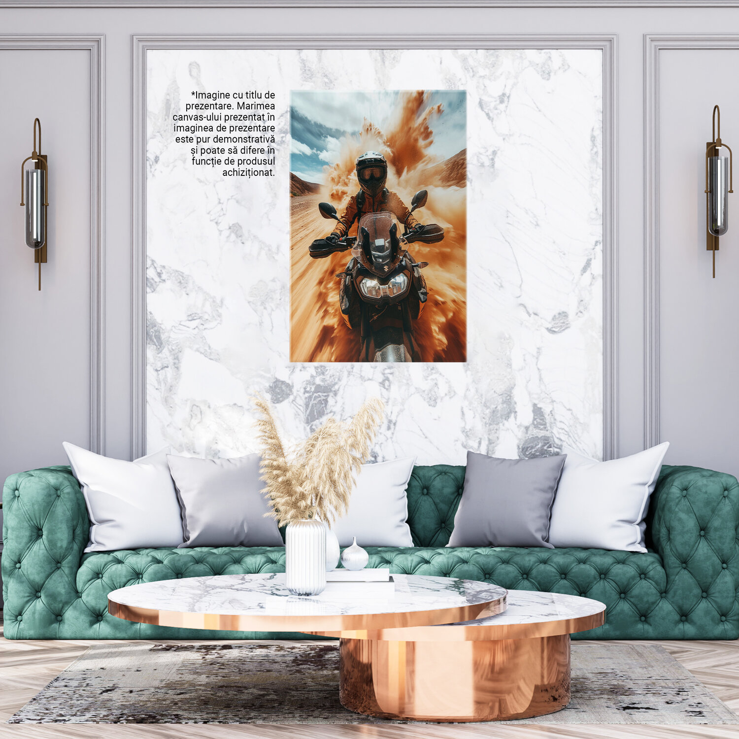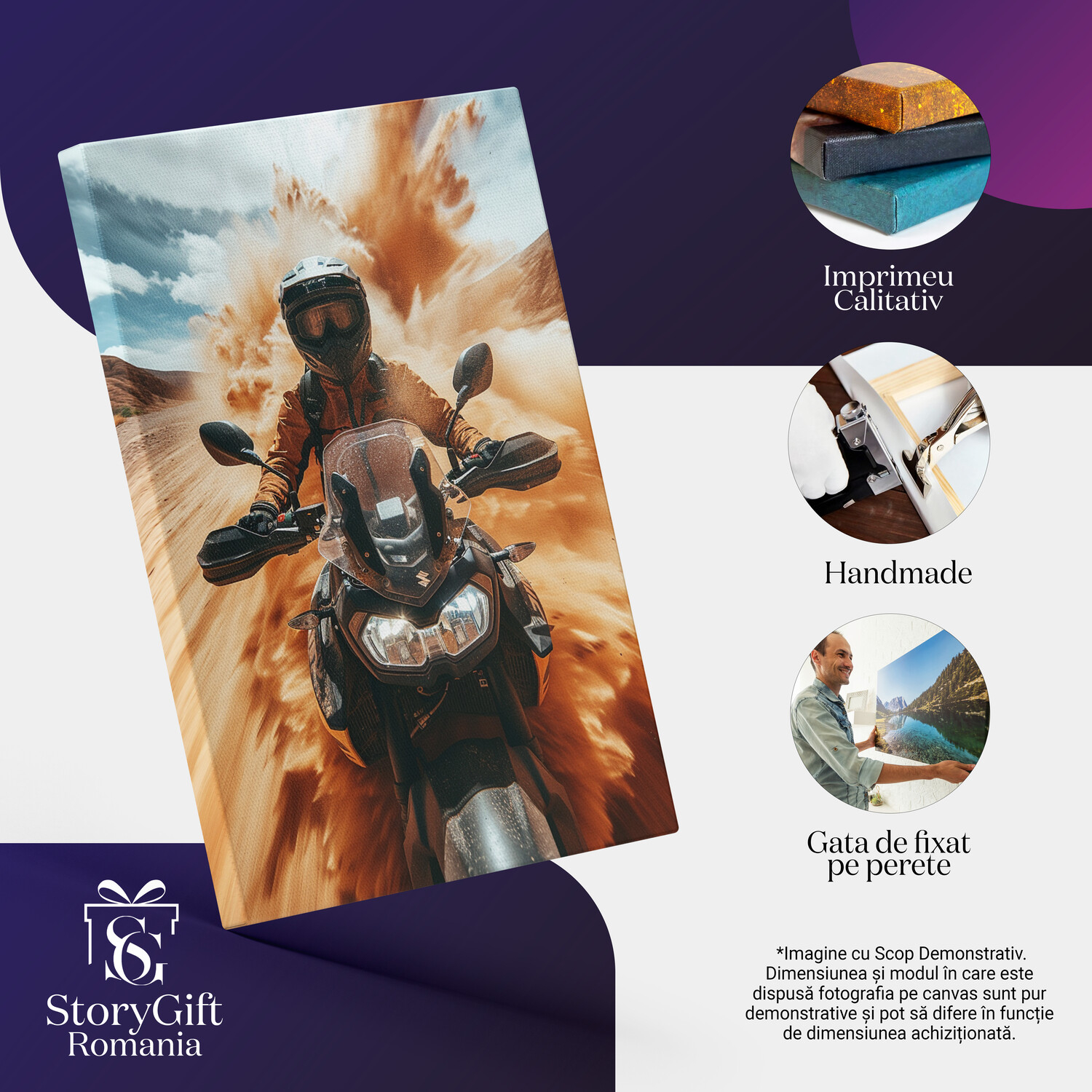 Tablou Canvas Iubitor de Motociclete, Motociclist prin Desert Mergand cu Viteza, Motocicleta Neagra Scumpa , Pictura Digitala - Tablou Canvas Signature de la StoryGift Romania