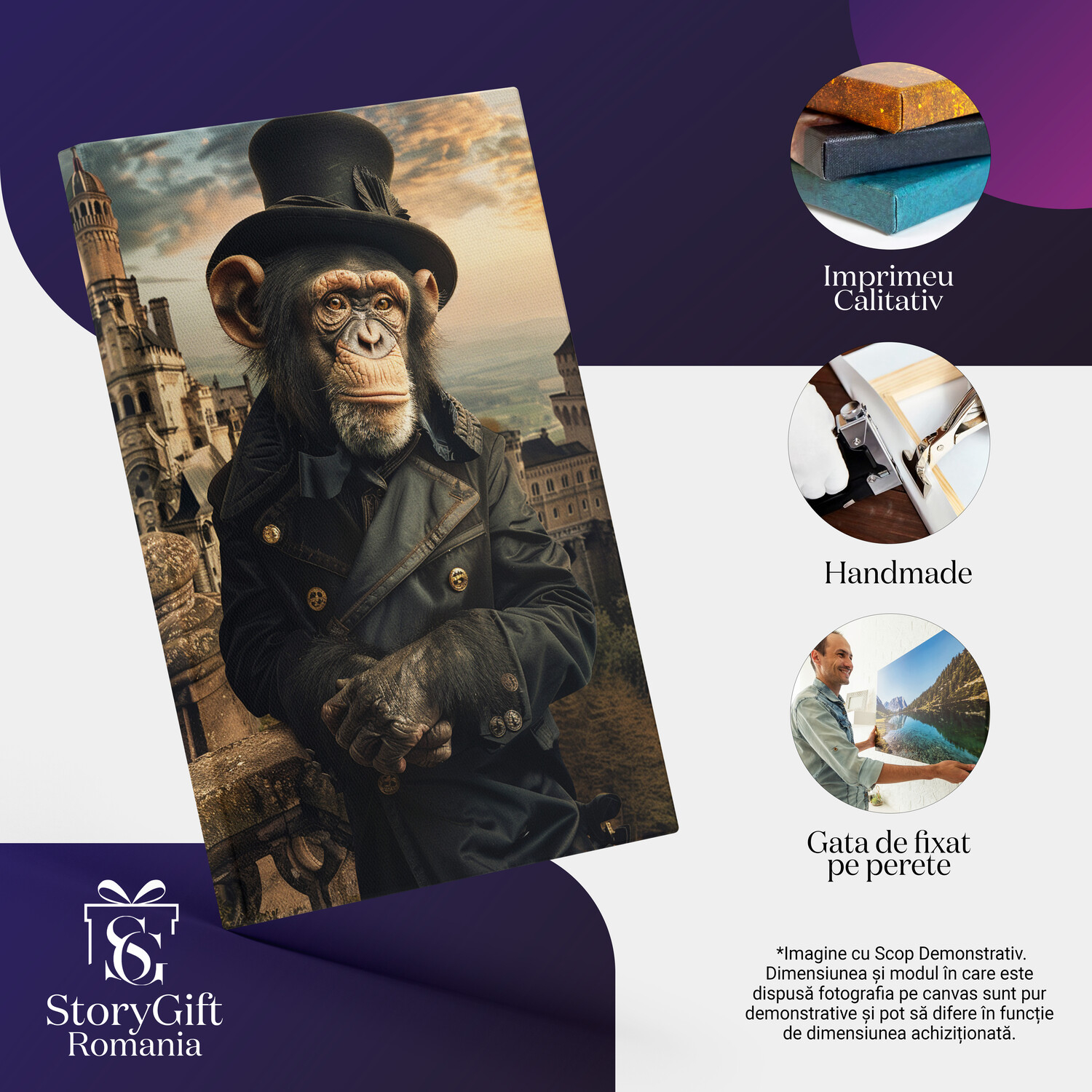 Tablou Canvas Maimuta cu Palarie si Ochii Cparui intr-o Haina Lunga de Culoare Albastru Inchis cu Nasturi , Pictura Digitala - Tablou Canvas Signature de la StoryGift Romania