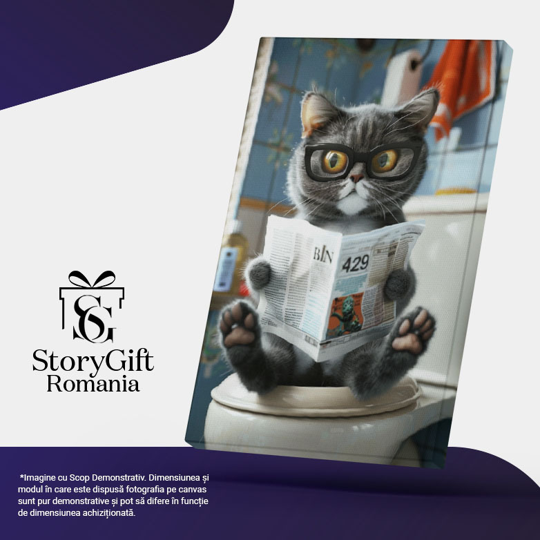 Tablou Canvas Pisoiul Gri cu Lăbuțe Roz Se Relaxează în Baie și Citește Ziarul Purtănd Ochelari , Pictura Digitala 40x25CM