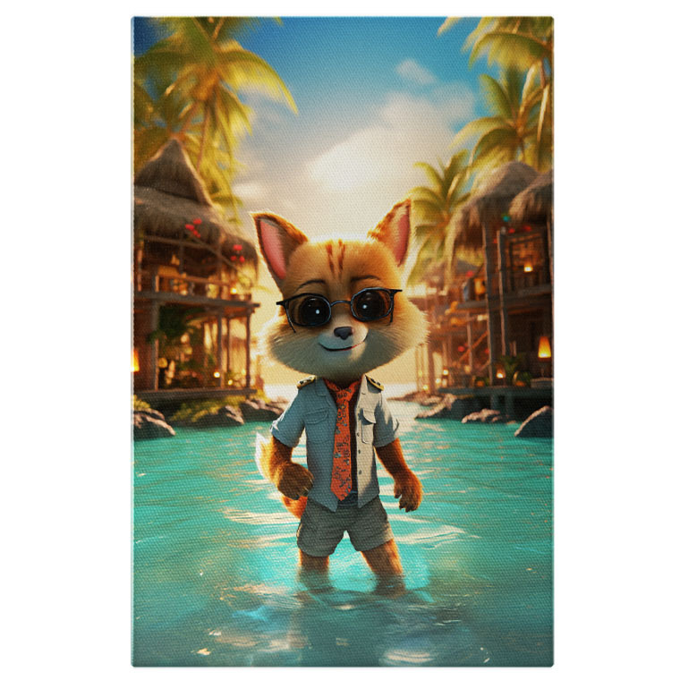 Tablou Canvas: Vulpe in Vacanta in Thailanda pregatita de Distractie in Piscina langa Case si Palmieri Pictura Digitala 40x25CM