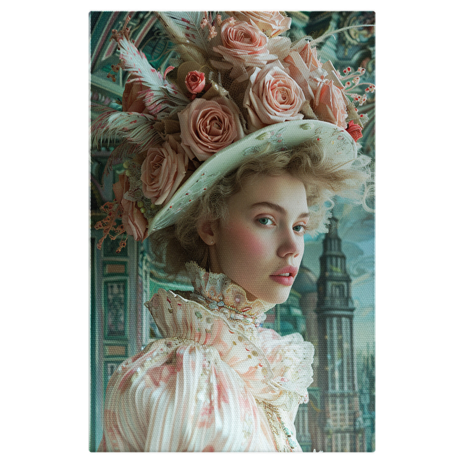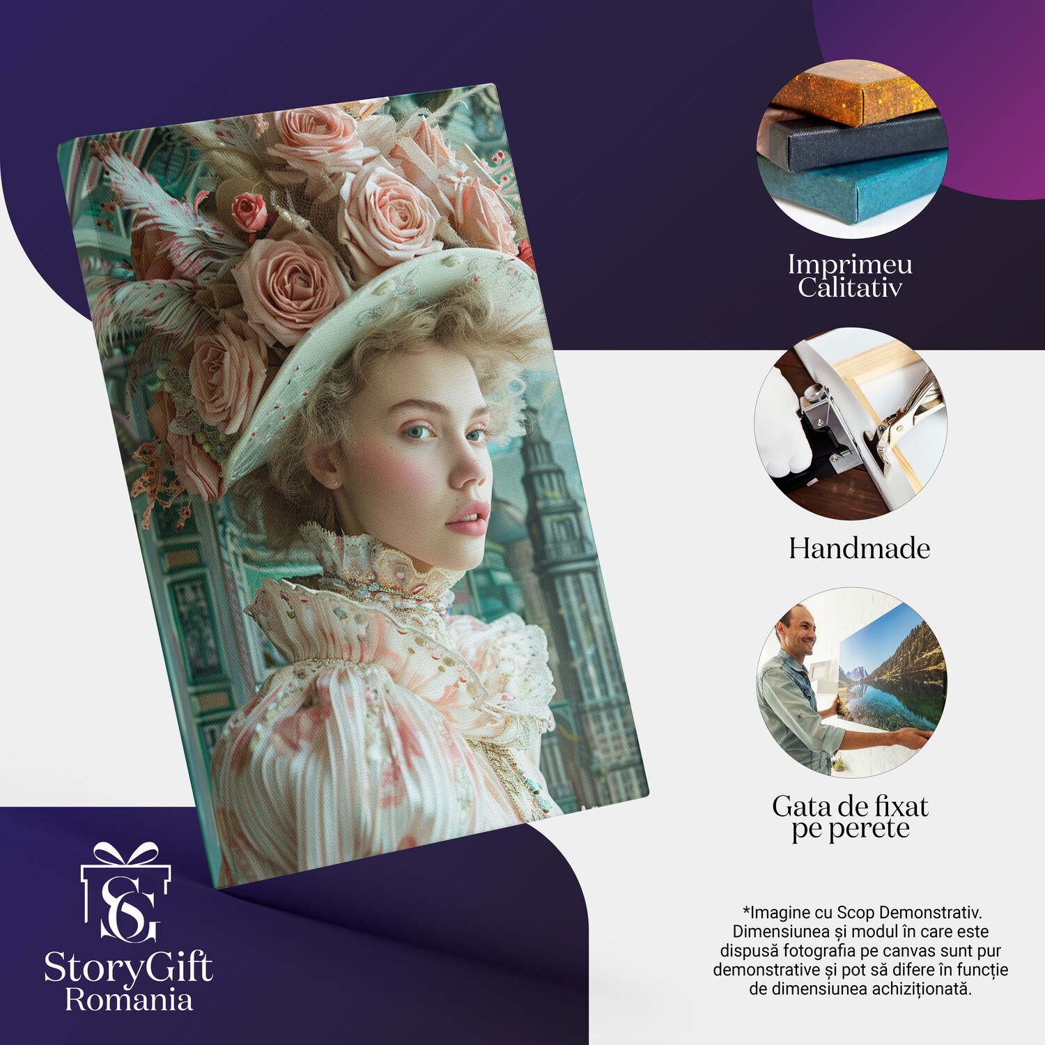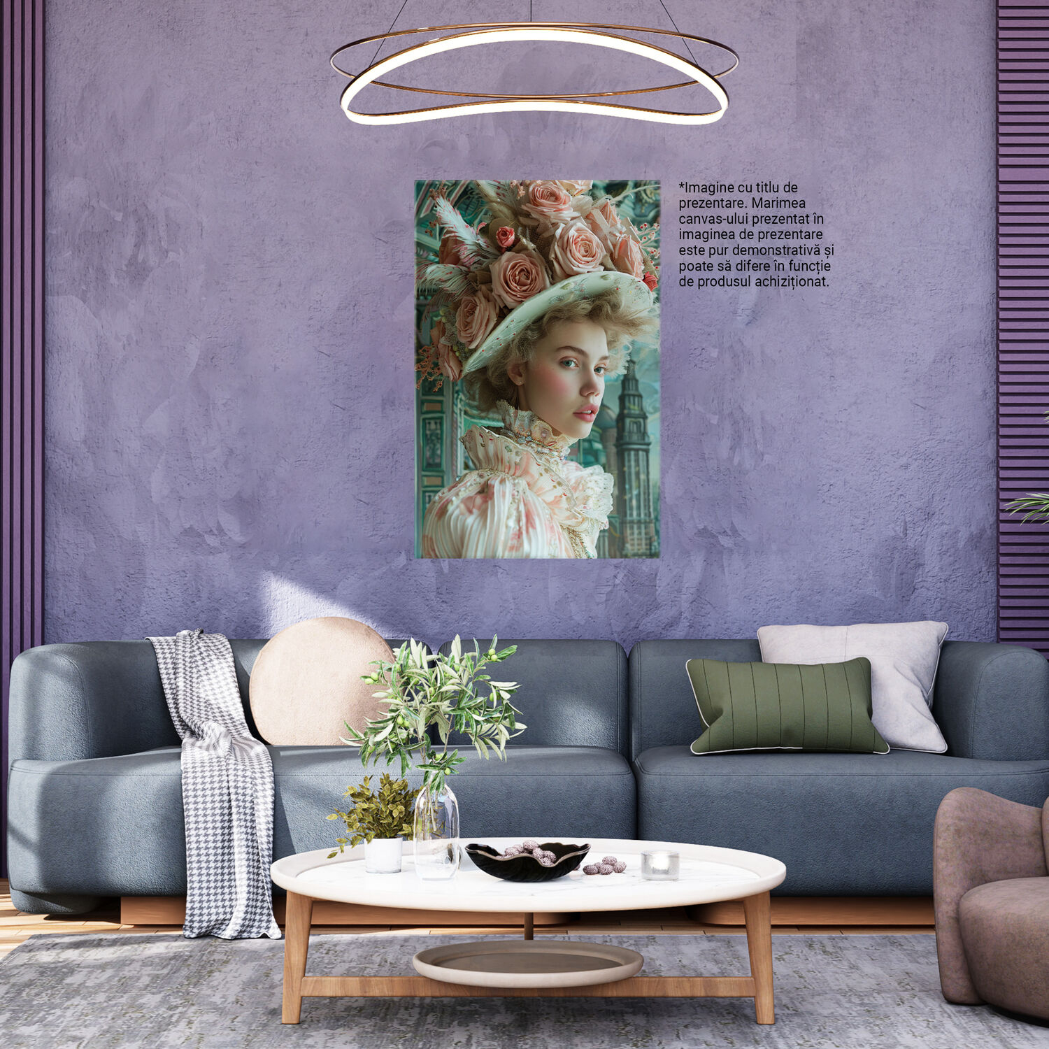 Tablou Canvas Trandafiri purtati drept palarie de o femeie delicata - Imbracaminte sofisticata cu roz si alb , Pictura Digitala - Tablou Canvas Signature de la StoryGift Romania