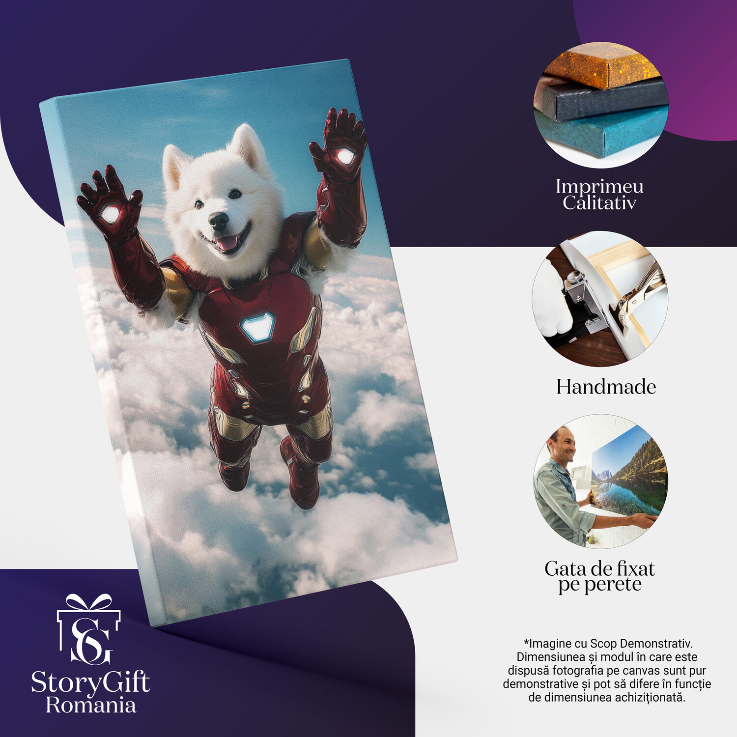 Tablou Canvas Personalizat Super erou, portret Iron man in aer, deasupra norilor, costum din metal stil robot rosu cu detalii aurii, Lumea Marvel 40x25CM