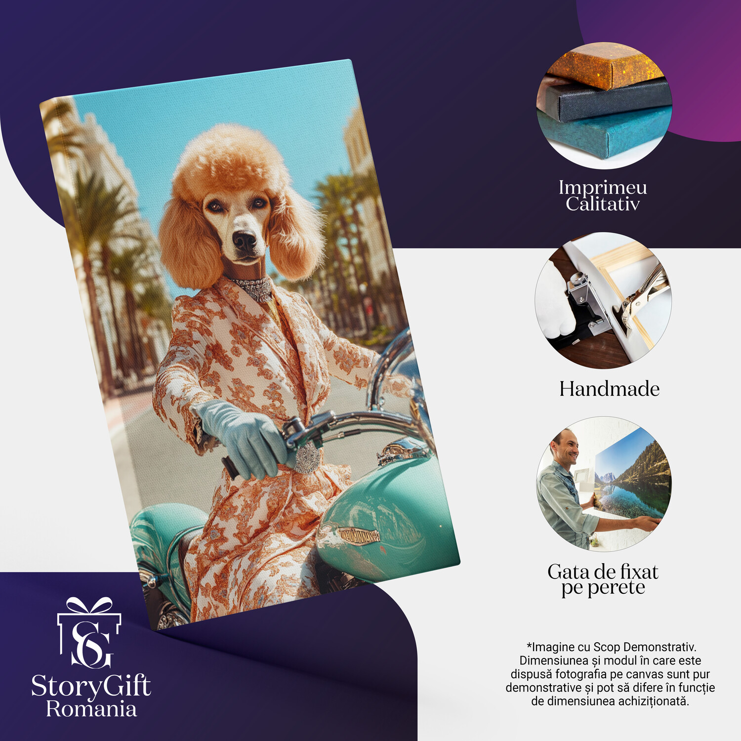 Tablou Canvas Personalizat Marchiza regala pe motocicleta albastra vintige pe strazile din LA, rochie cu detalii aurii 40x25CM