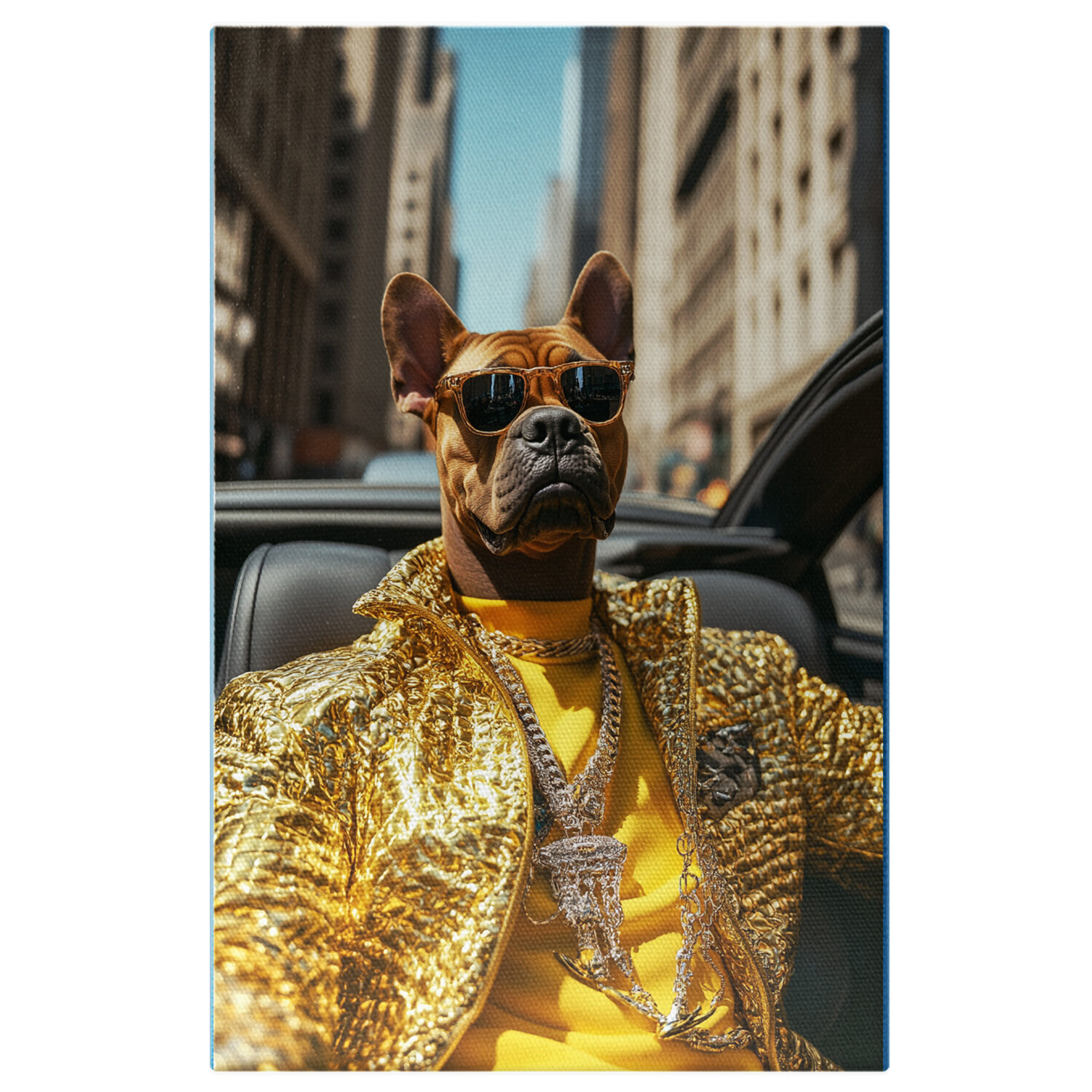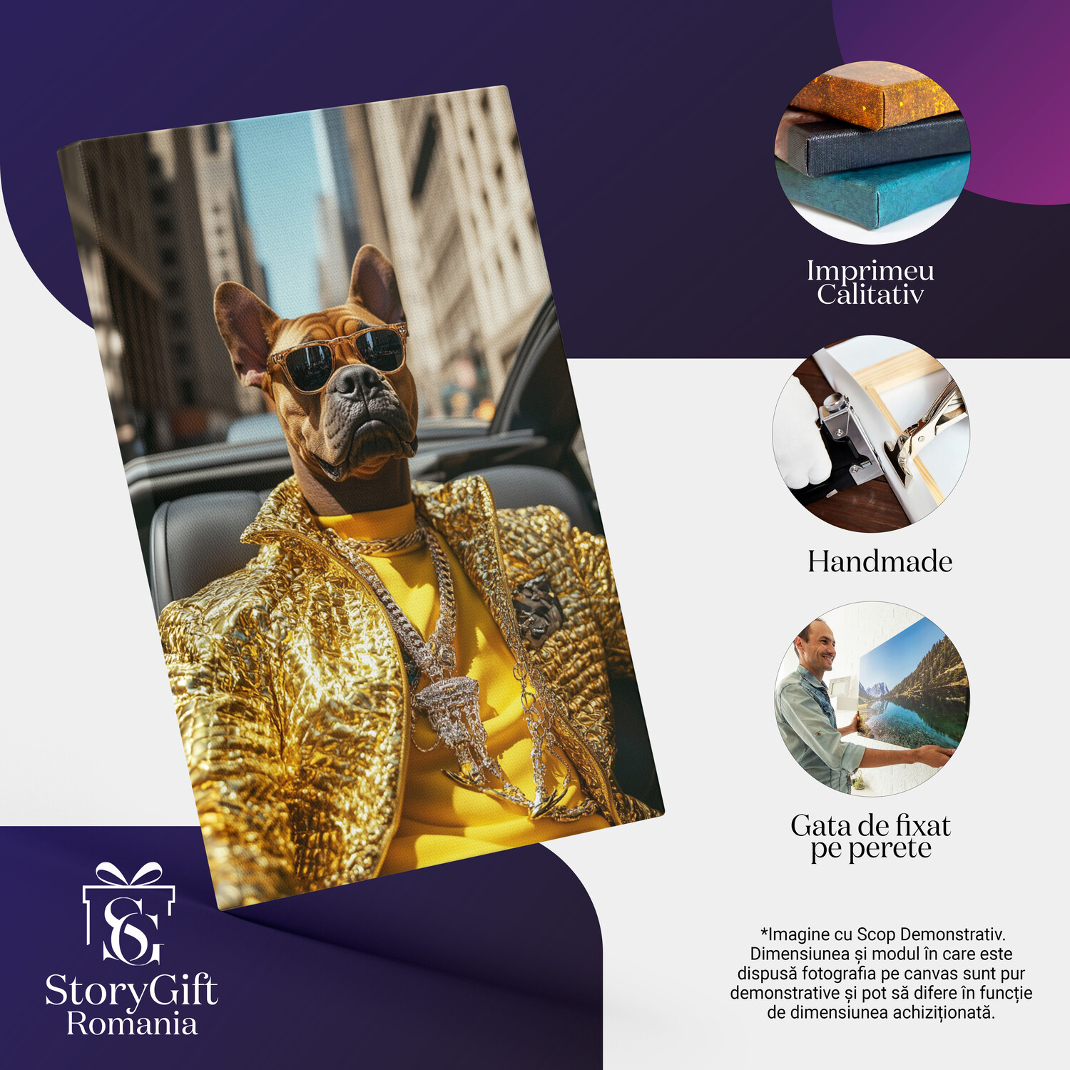 Tablou Canvas Personalizat Portret Fashion modern pe strazile din New York, tinuta galbena cu jacheta din aur si medalion masiv 120x80CM