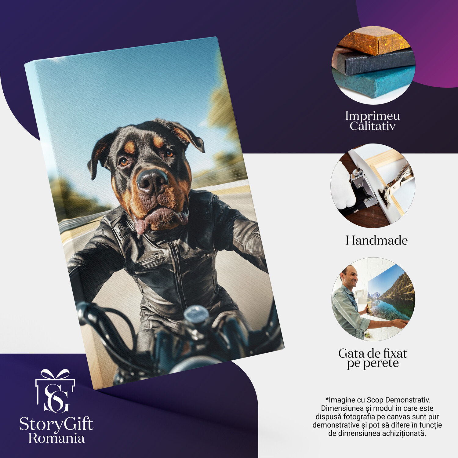 Tablou Canvas Personalizat Sofer pe motocicleta conducand cu viteza pe sosea, tinuta moderna, geaca de piele neagra 40x25CM