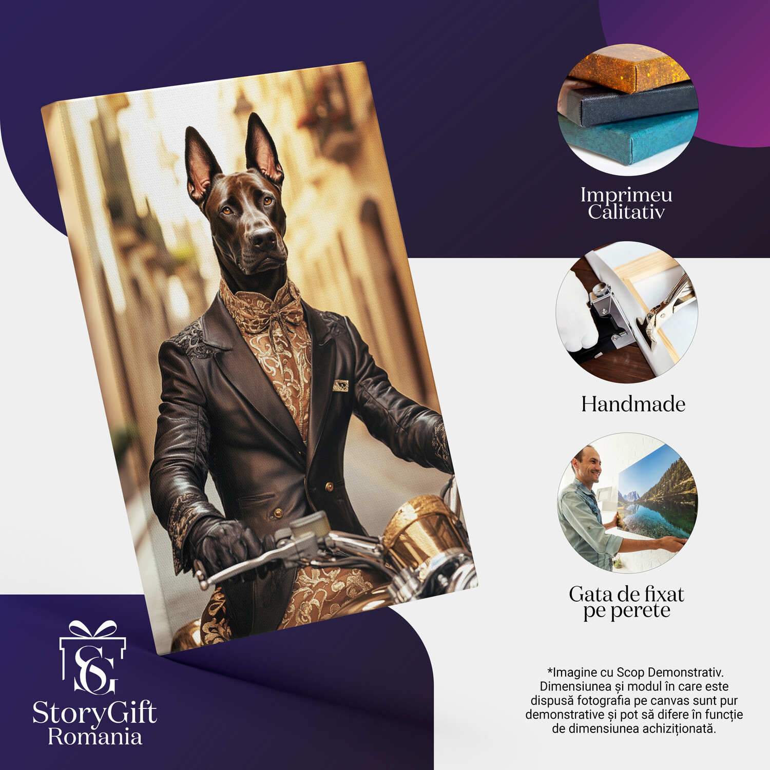 Tablou Canvas Personalizat Tinuta eleganta pe motor vintige din aur, sacou negru, camasa cu guler inalt cu detalii aurii regale 40x25CM