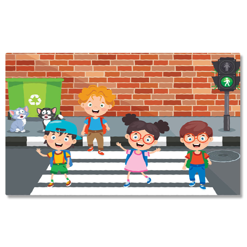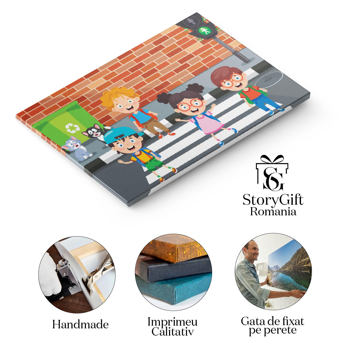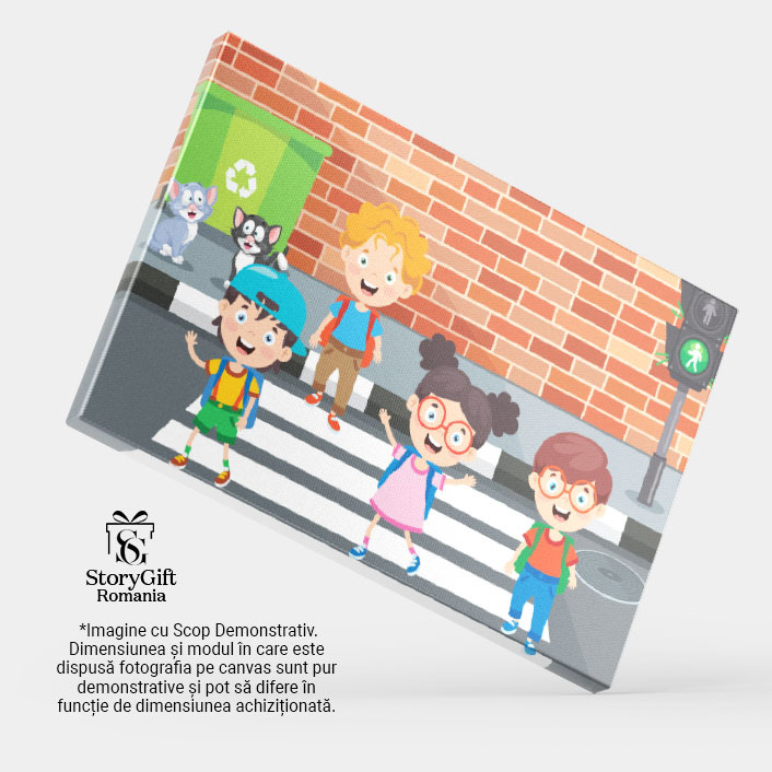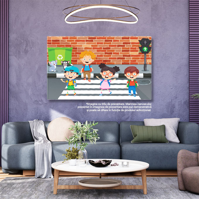 Tablou Canvas Mersul pe Trecerea de Pietoni, Patru Copii Danseaza pe Trecerea de Pietoni Priviti de Doua Pisici 40x25CM
