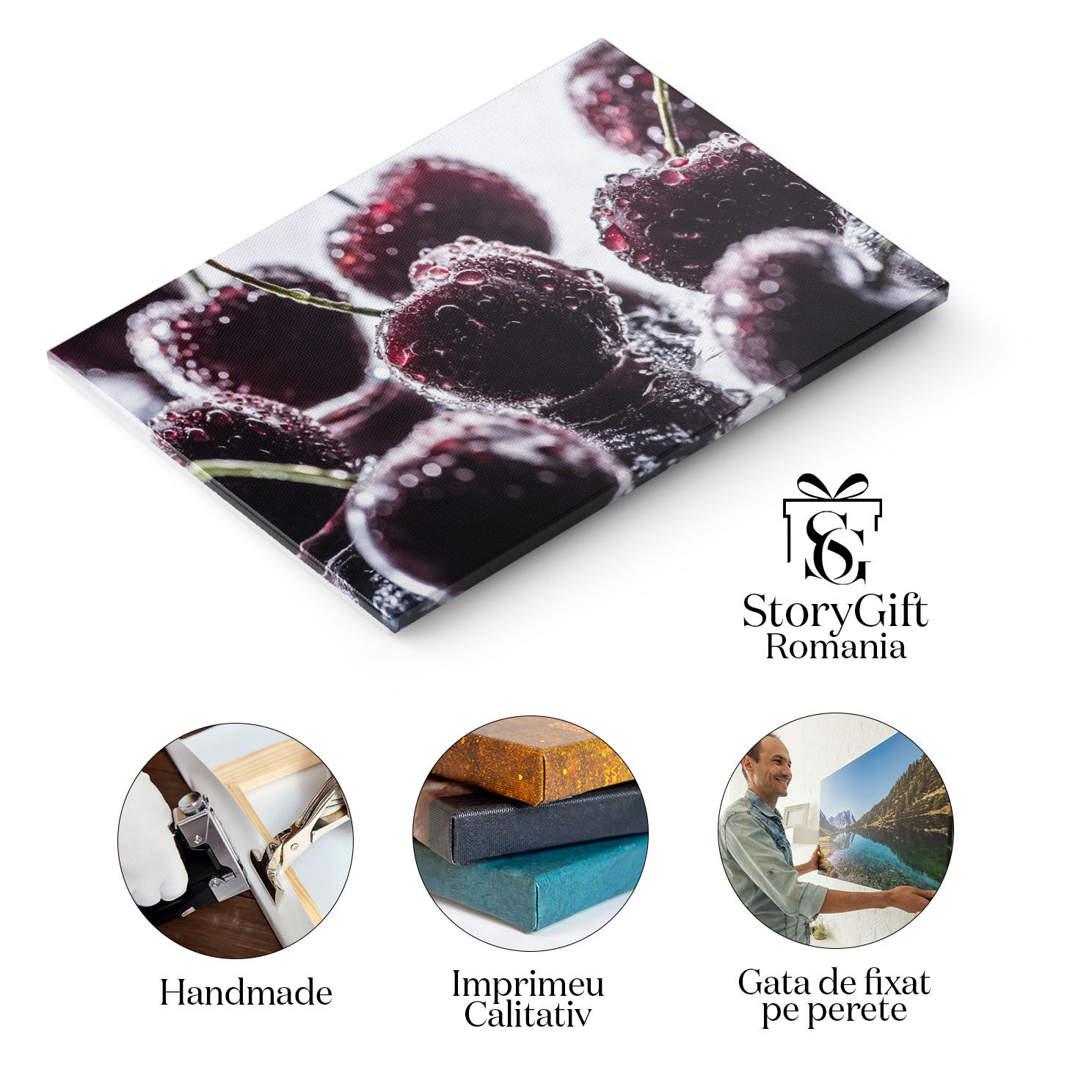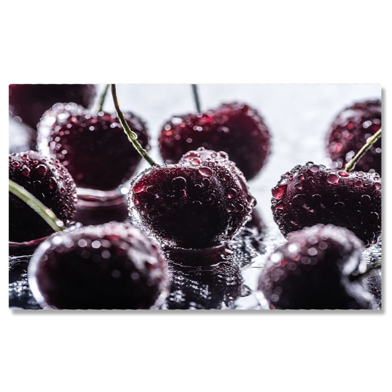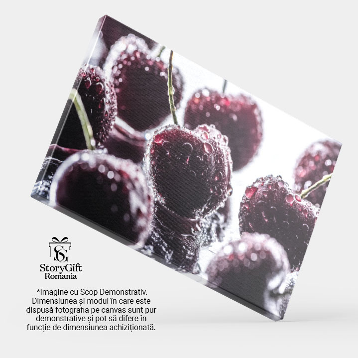 Tablou Canvas Perspectiva Detaliata a Cireselor Rosii si Maturate, Ornate cu Picaturi de apa, Oferind un aspect imbietor si Gustos al Fructelor Proaspete 40x25CM