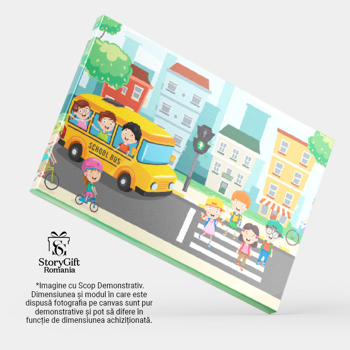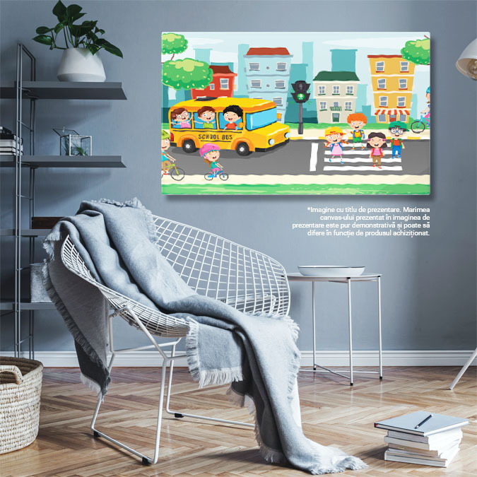 Tablou Canvas School Bus, Autobuzul Galben de Scoala in Fata Copiilor de pe Zebra Aproape de Copiii pe Biciclete 40x25CM