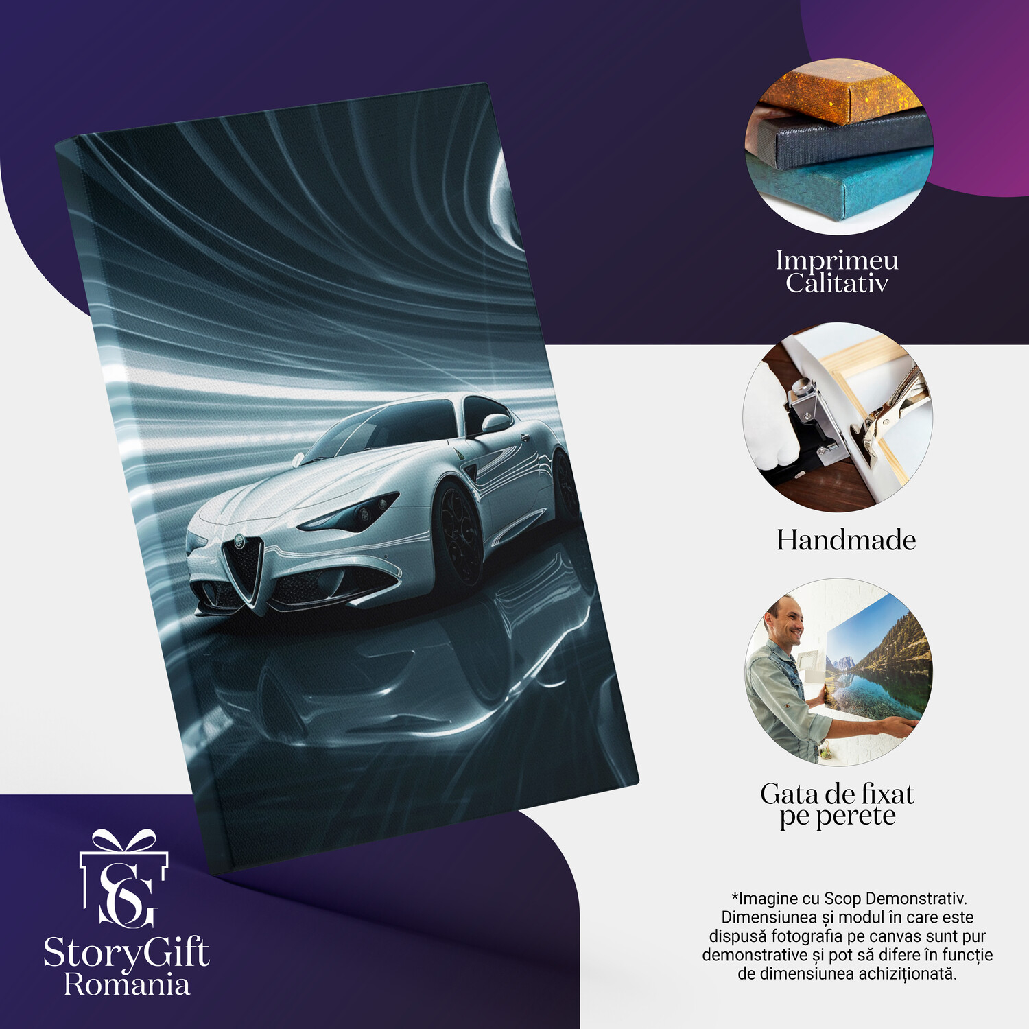 Tablou Canvas Alfa Romeo alb cu un fundal lucios si curat - LED-uri ce se reflecta in vopseaua masinii , Pictura Digitala - Tablou Canvas Signature de la StoryGift Romania