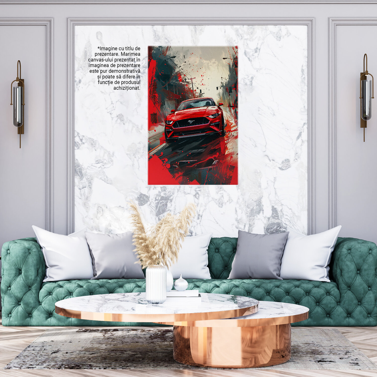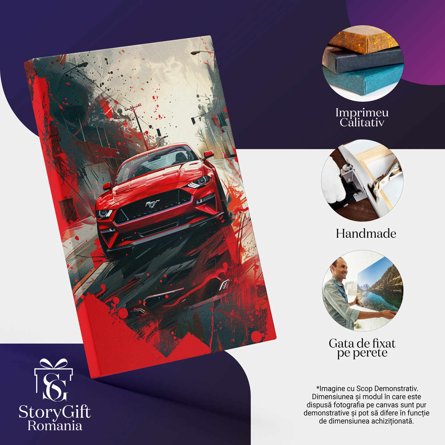 Tablou Canvas Beautiful Car Ford Mustang de Culoare Rosie pe o Strada unde a Plouat intre Blocurile Gri , Pictura Digitala - Tablou Canvas Signature de la StoryGift Romania