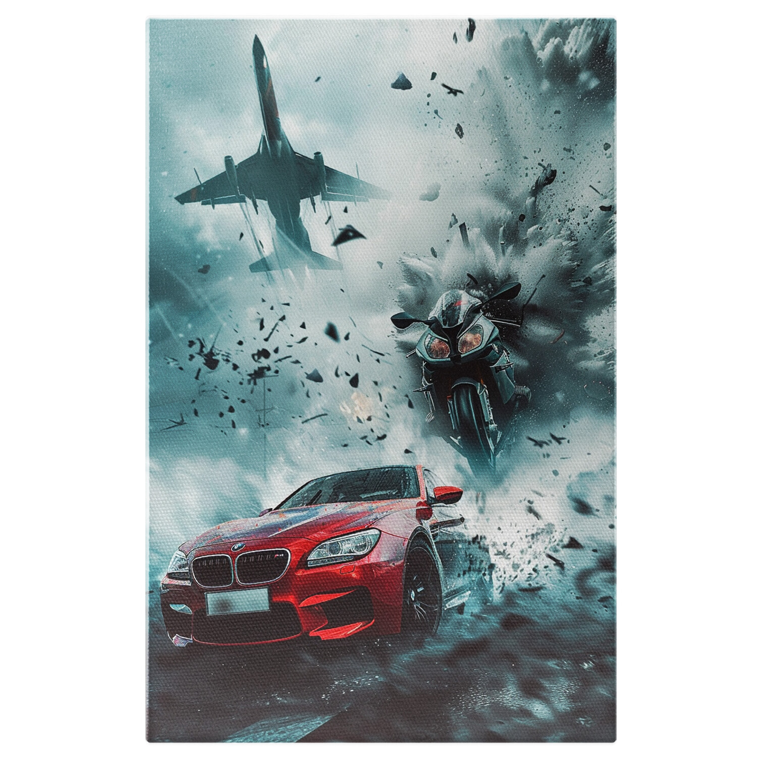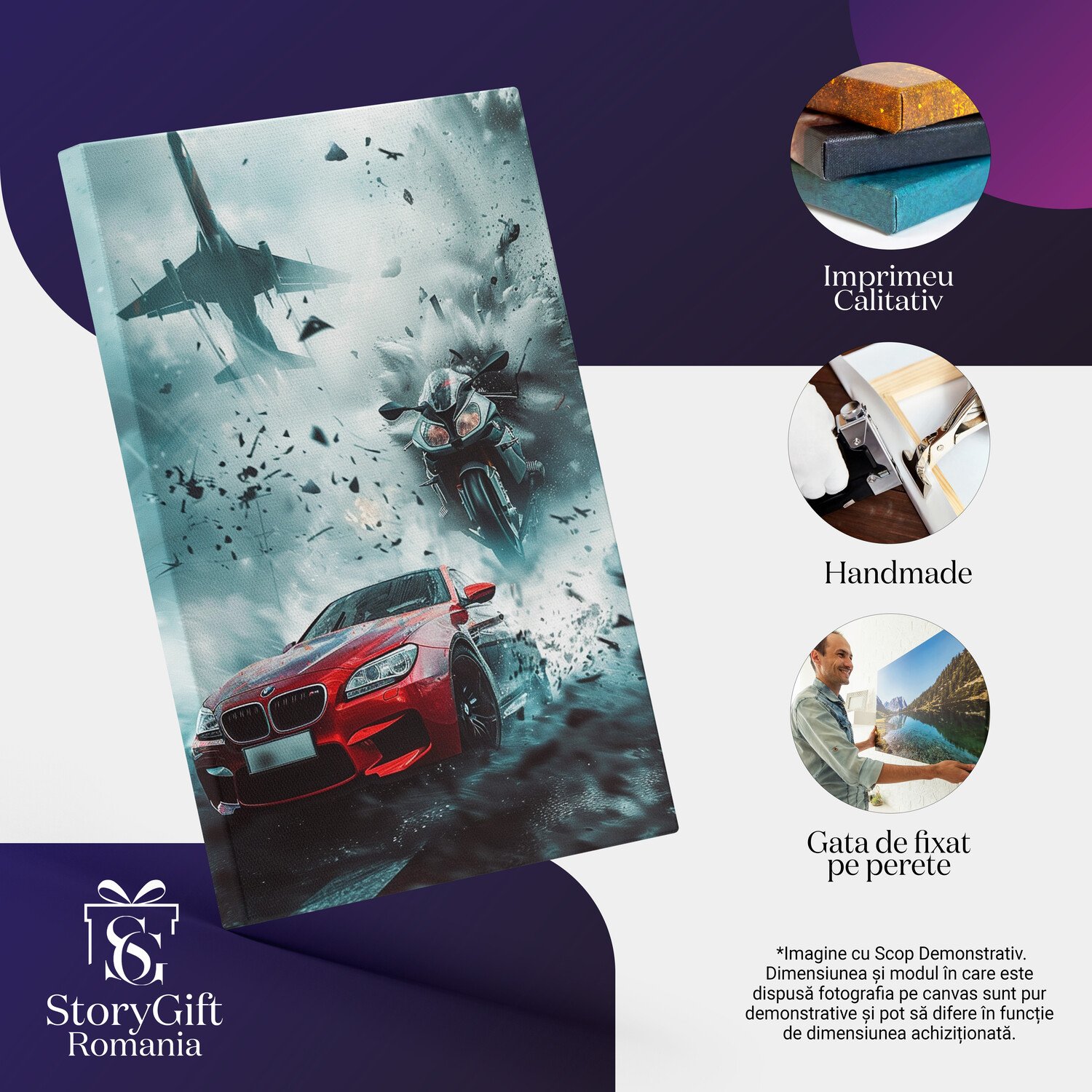 Tablou Canvas Intrecere intre trei motoare puternice, masina, motocicleta, avion- Ramasite ce zboara de la viteza , Pictura Digitala - Tablou Canvas Signature de la StoryGift Romania
