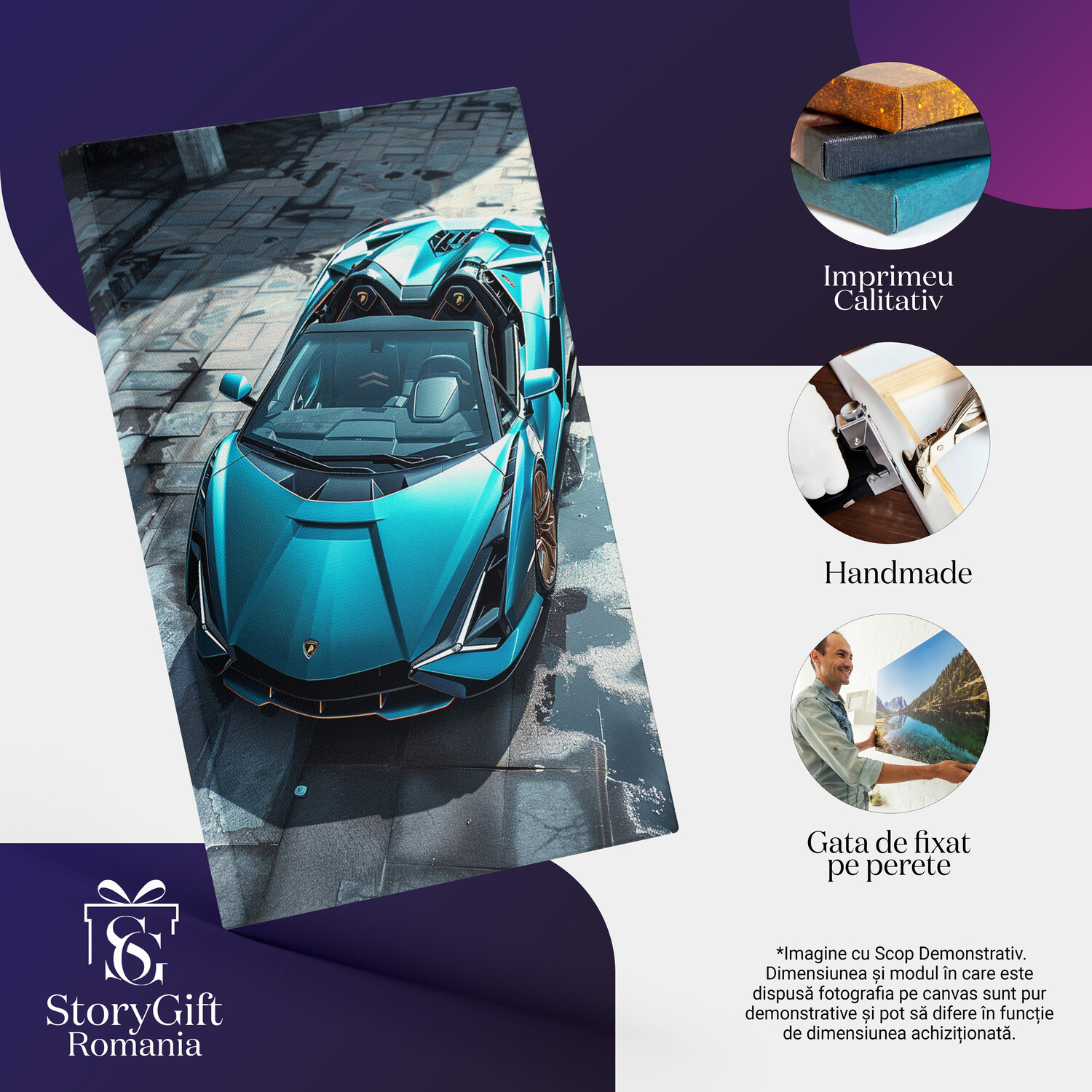 Tablou Canvas Masina Albastra Lamborghini cu Doua Locuri Masina de Lux Sport cu Interior Negru , Pictura Digitala - Tablou Canvas Signature de la StoryGift Romania