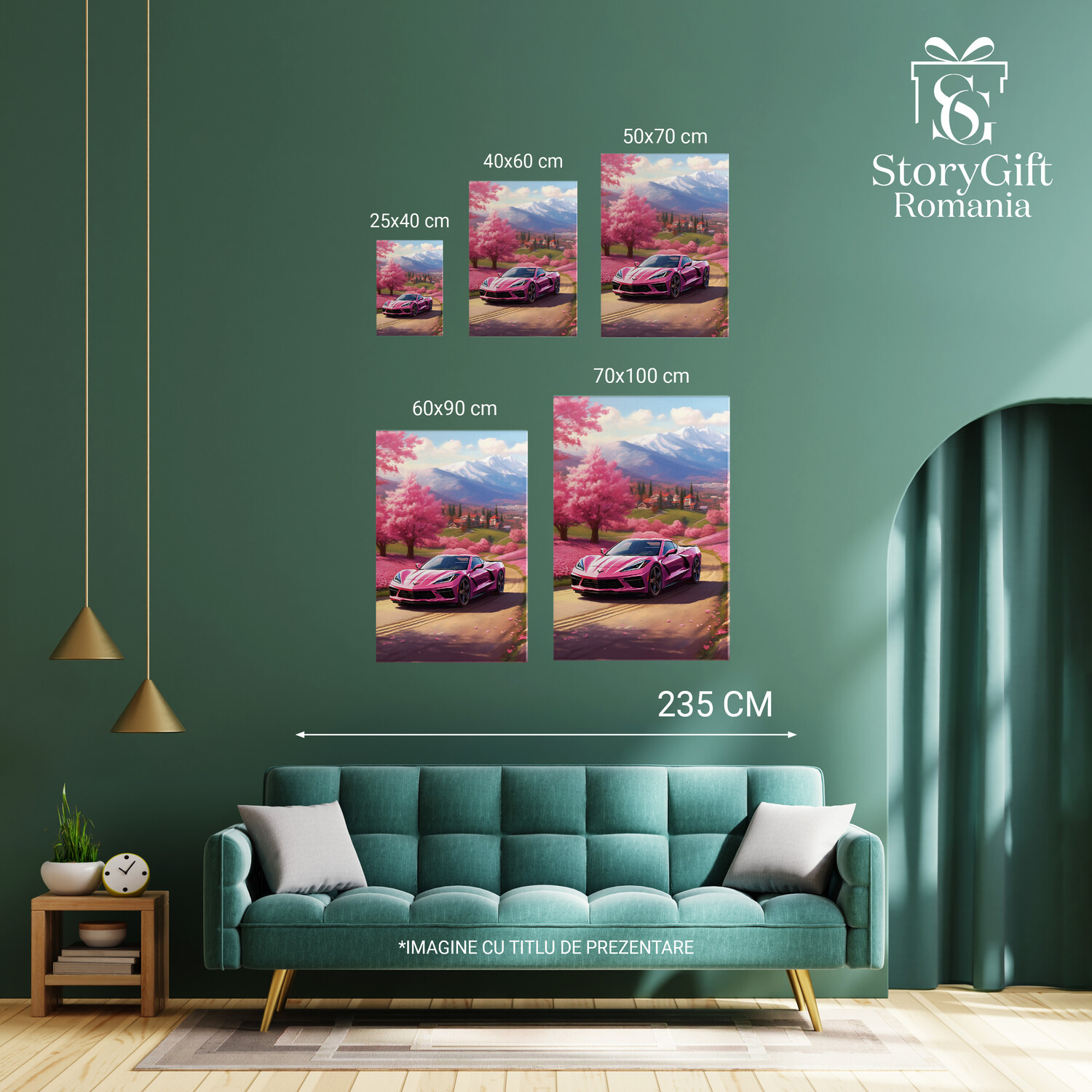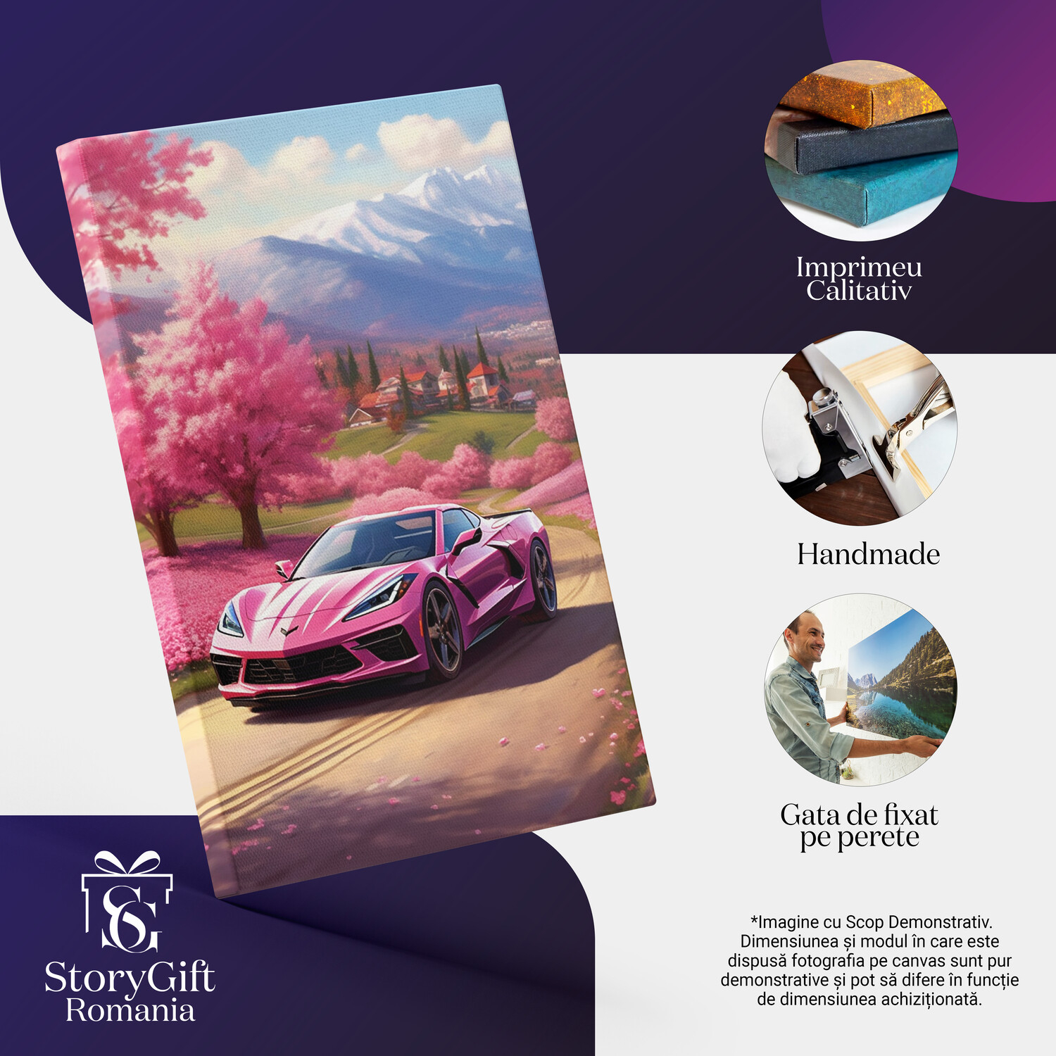 Tablou Canvas: Masina de lux Corvette - sosea munti roz vegetatie Pictura Digitala - Tablou Canvas Signature de la StoryGift Romania