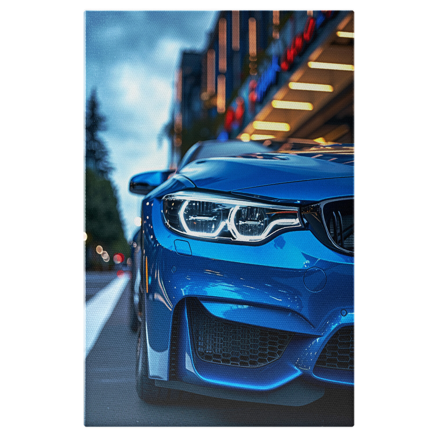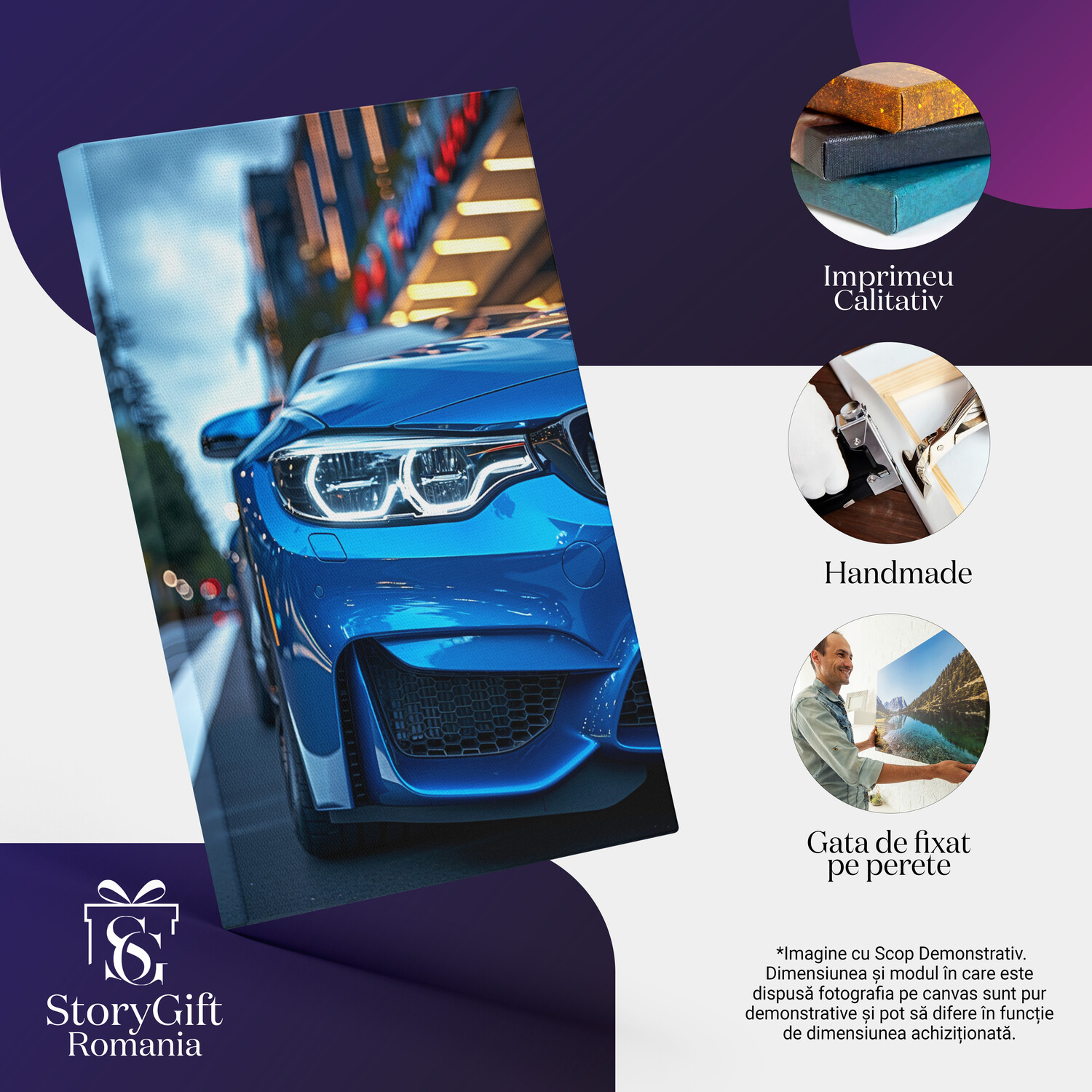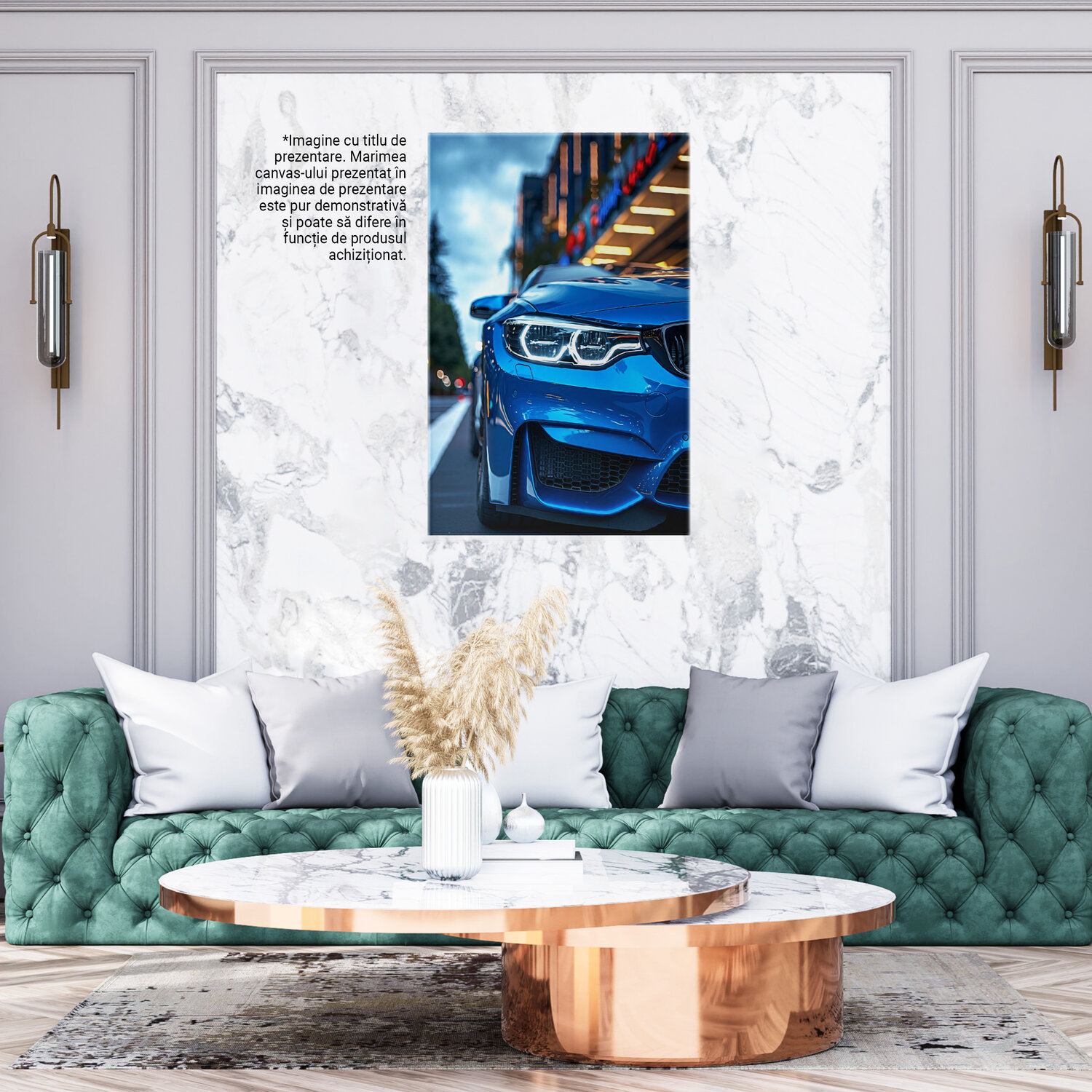 Tablou Canvas Masina Lux Albastra cu Farul Sclipitor in Fata unui Mall pe o Strada cu Brazi Inalti si Lumini , Pictura Digitala - Tablou Canvas Signature de la StoryGift Romania
