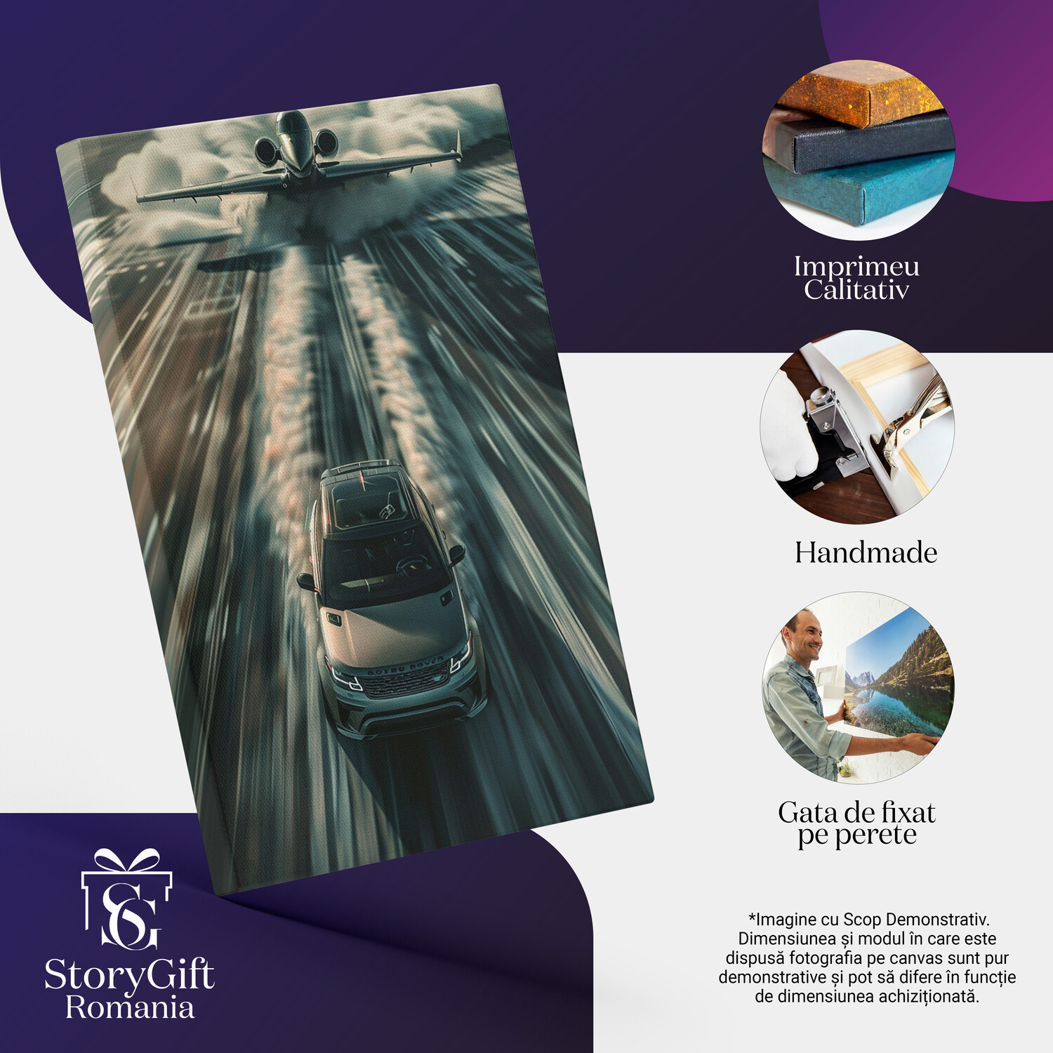 Tablou Canvas Masina Range Rover de Culoare Gri in Fata Avionului pregatit de Decolare cu un Fum Puternic in Spate , Pictura Digitala - Tablou Canvas Signature de la StoryGift Romania