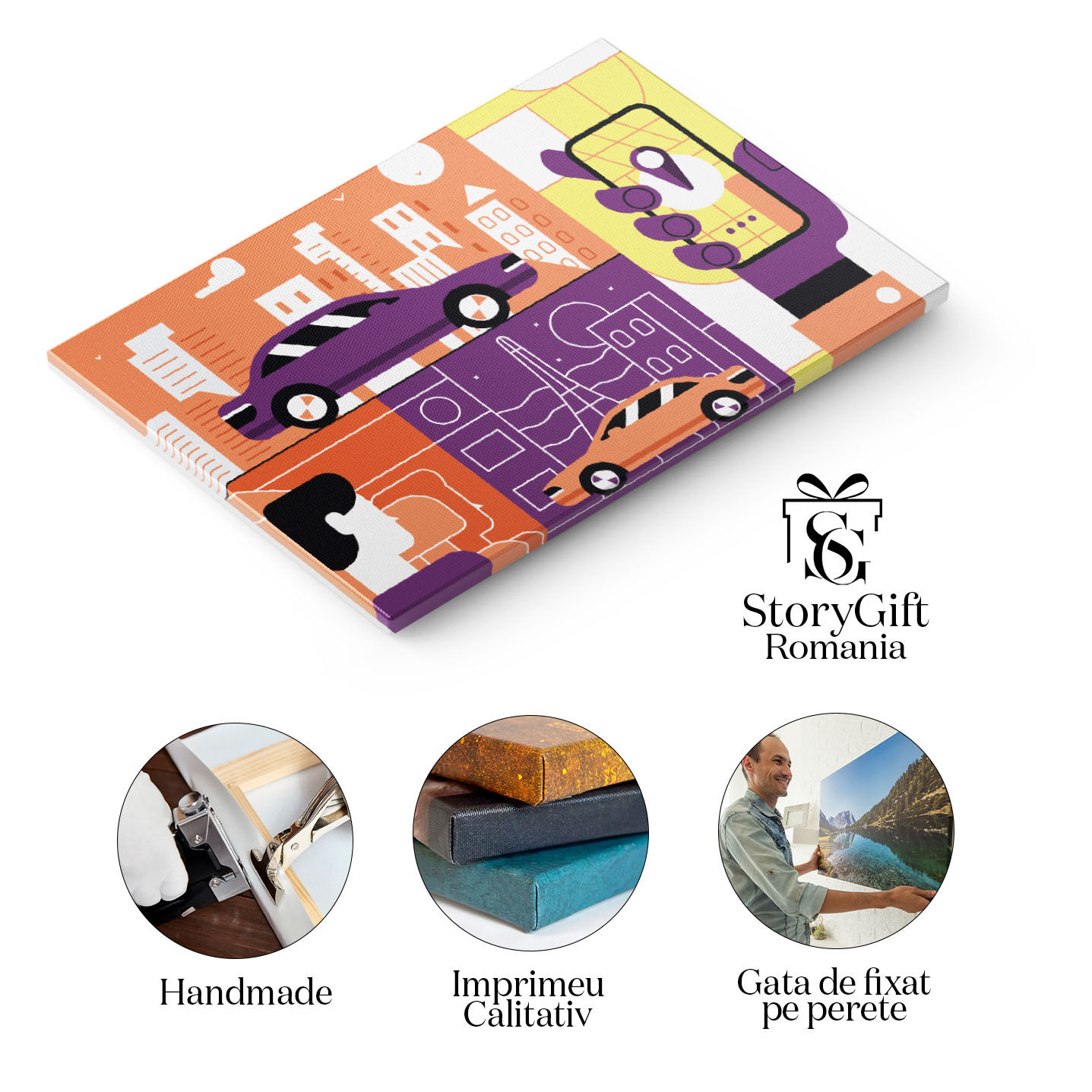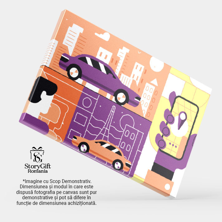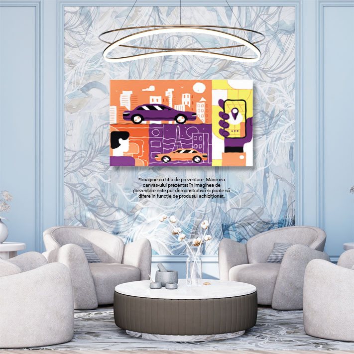 Tablou Canvas Masina Mov in Lumea Portocalie si Masina Portocalie in Lumea Mov Ilustratie cu un Telefon 40x25CM