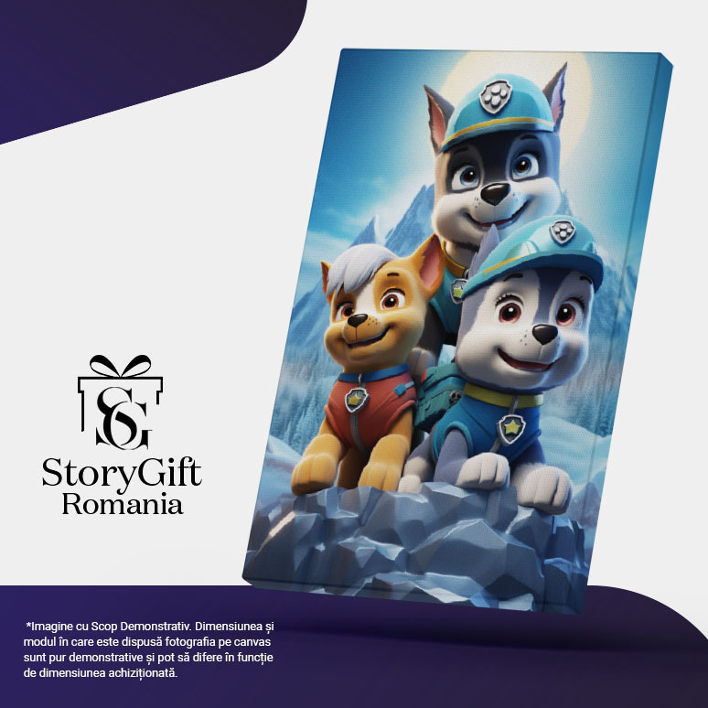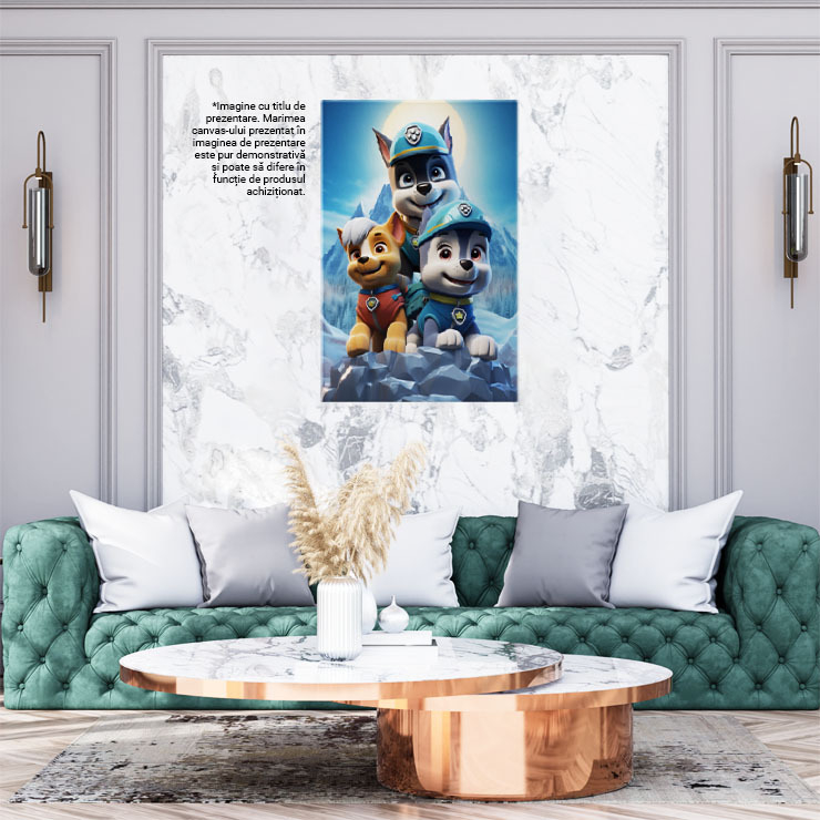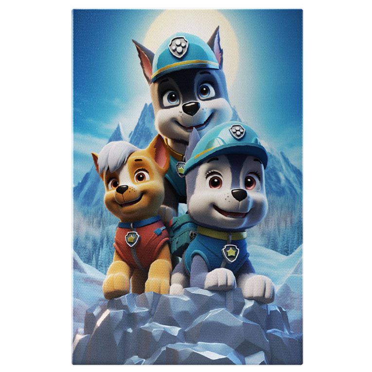 Tablou Canvas: Patrula Catelusilor Dsiney Catelusi in Peisaj de Iarna pe Munte cu Zapada Pictura Digitala 40x25CM