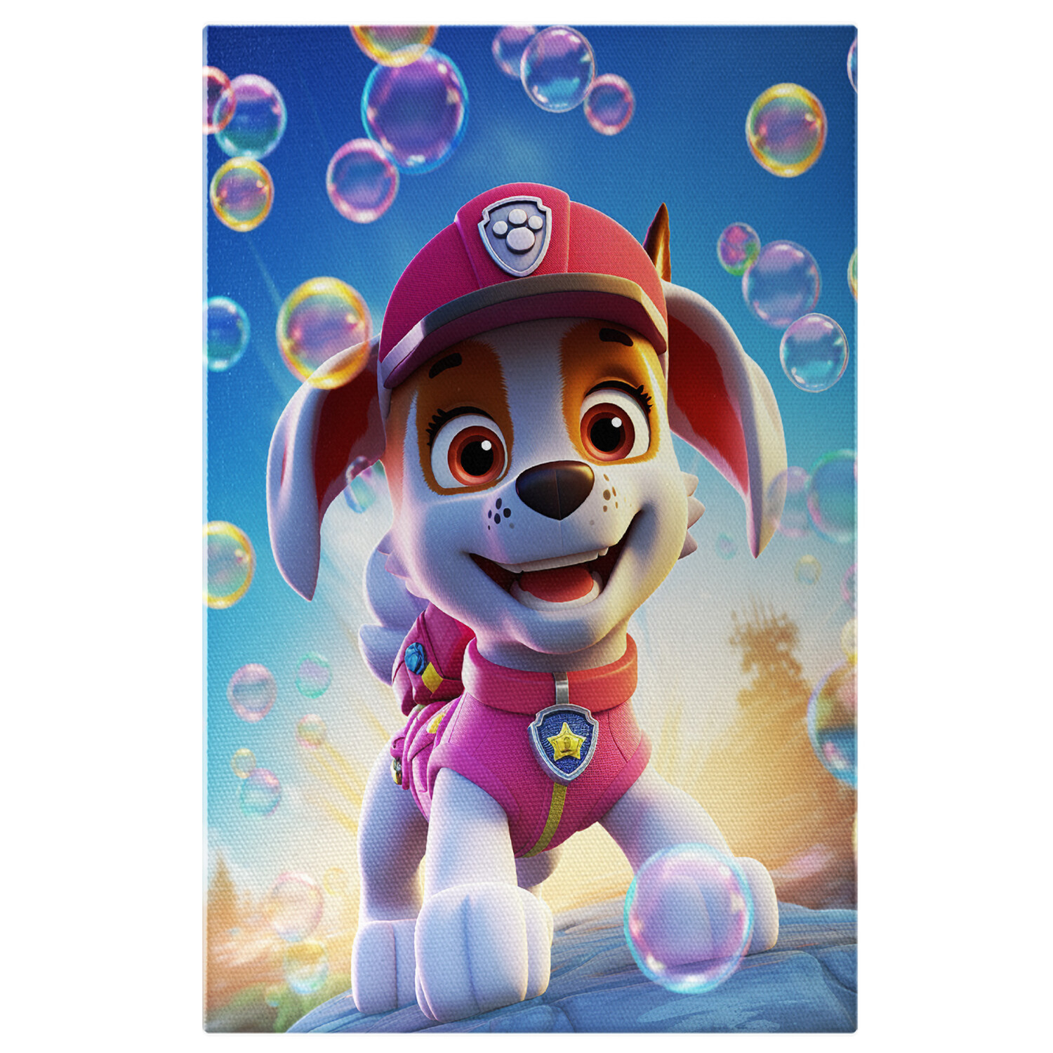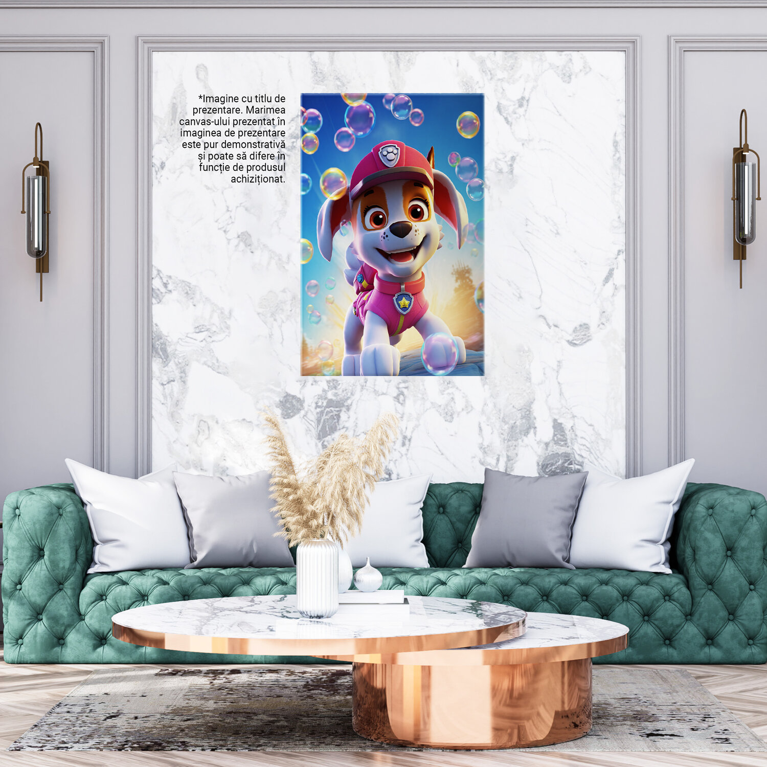 Tablou Canvas: Catel Personaj Patrula Secreta cu Costum Roz si Baloane de Sapun-Fotografie Animata Pictura Digitala 90x60CM