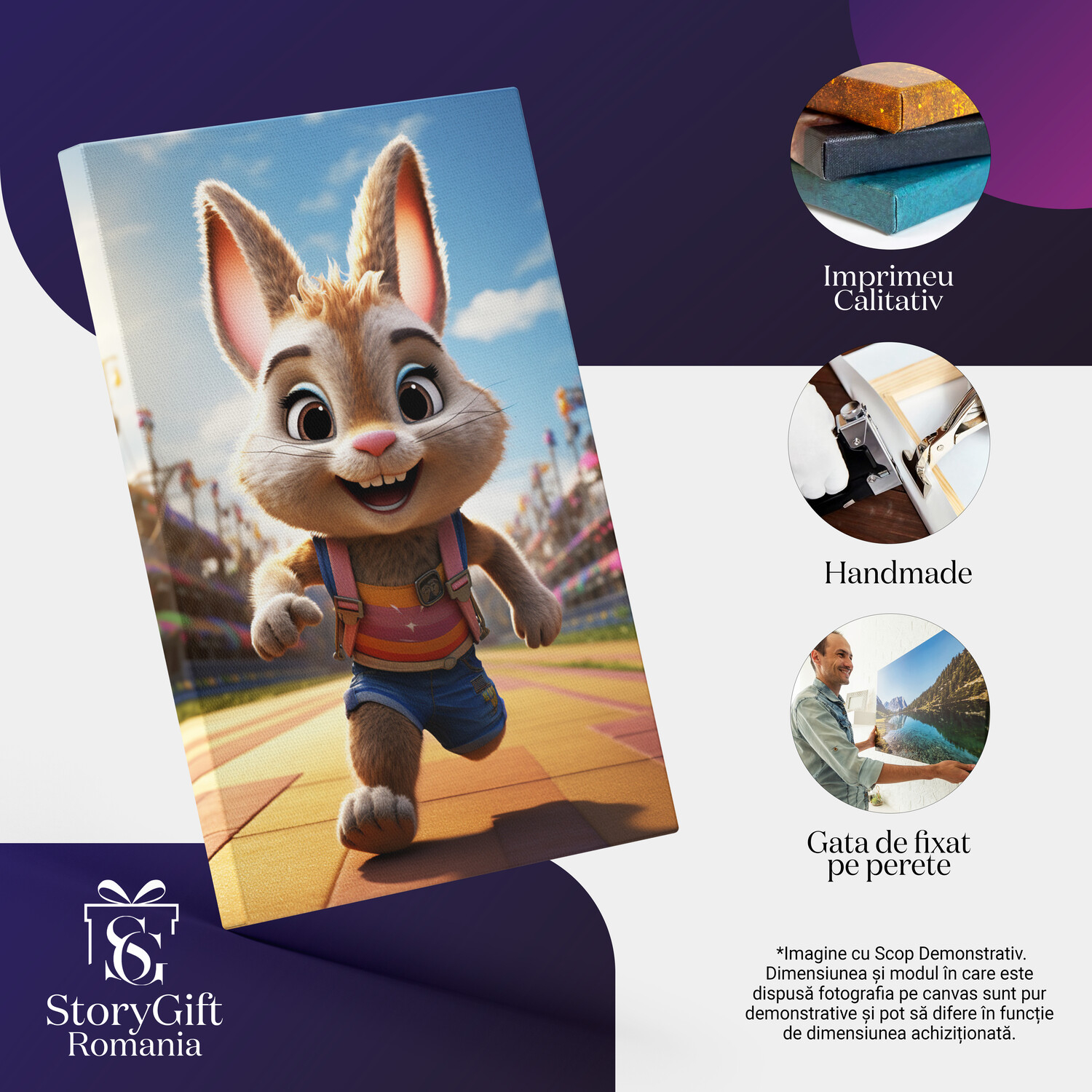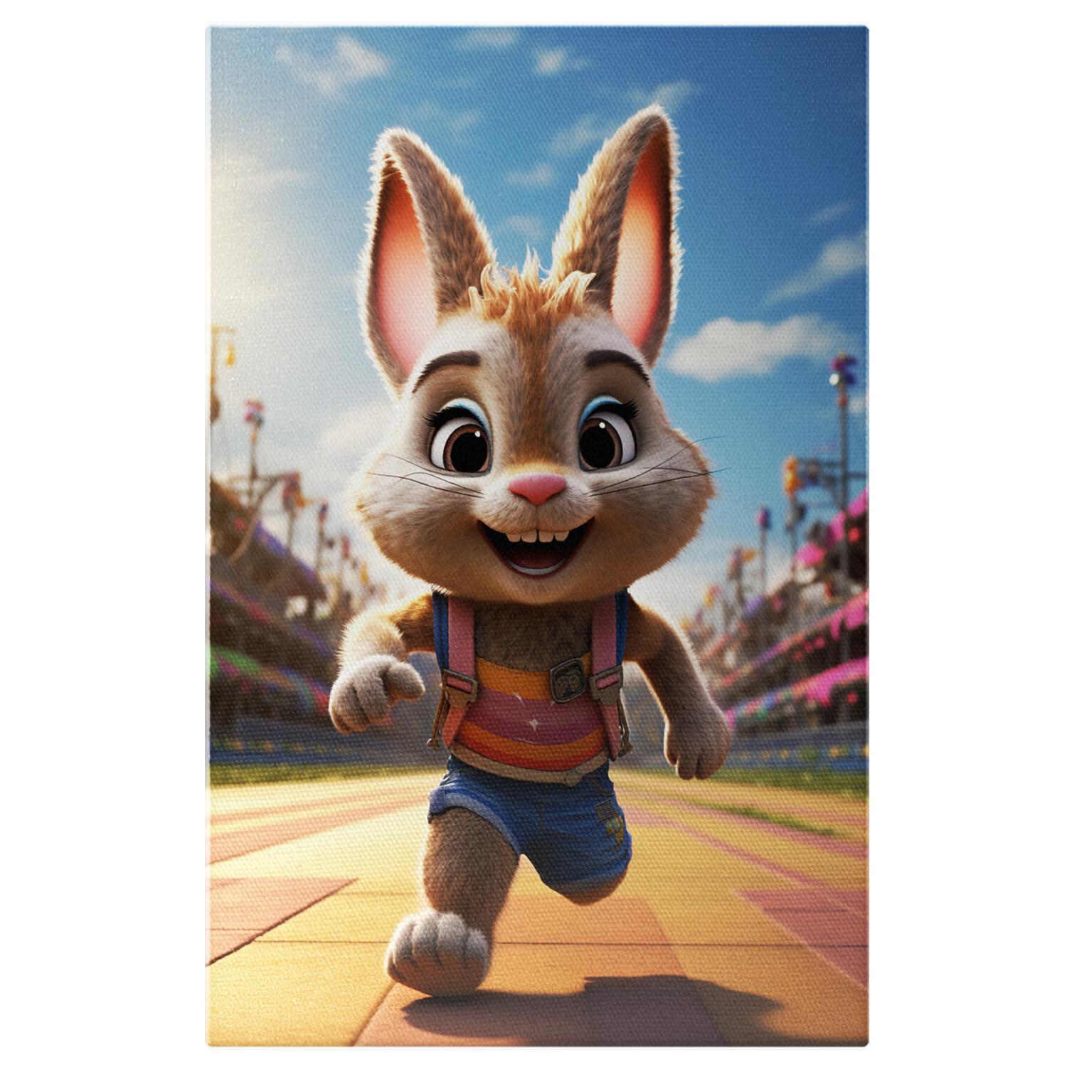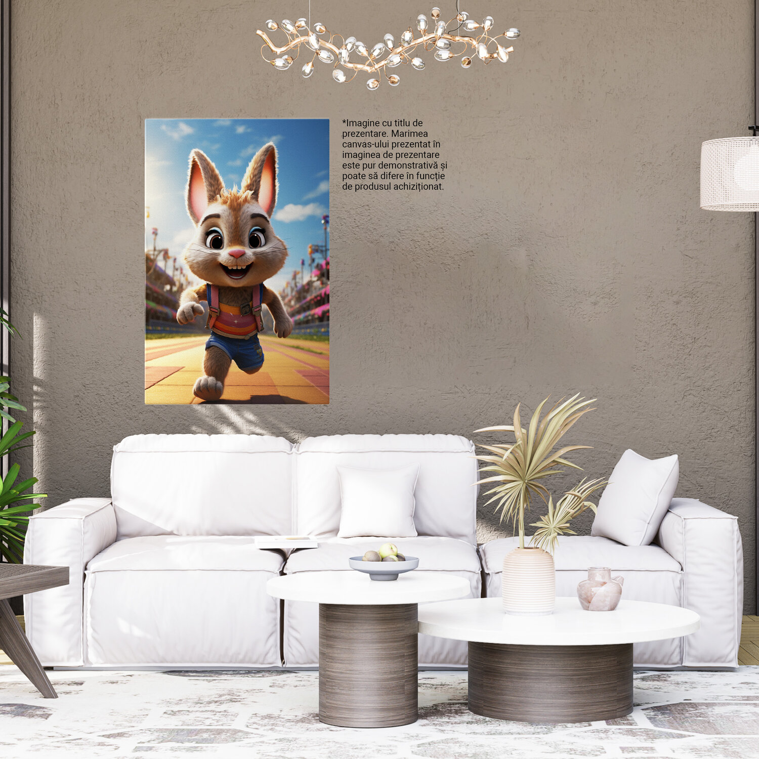 Tablou Canvas: Fetita Iepuras cu Ochii Fardati Alearga pe Pista pentru a Castiga Competitia pe Locul Unu Pictura Digitala - Tablou Canvas Signature de la StoryGift Romania