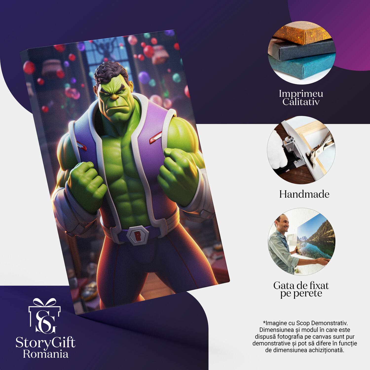 Tablou Canvas: Hulk, Fioroasa Fiinta Verde cu Chipul Imbufnat in Vesta Mov Asortata cu Pantalonii Pictura Digitala - Tablou Canvas Signature de la StoryGift Romania