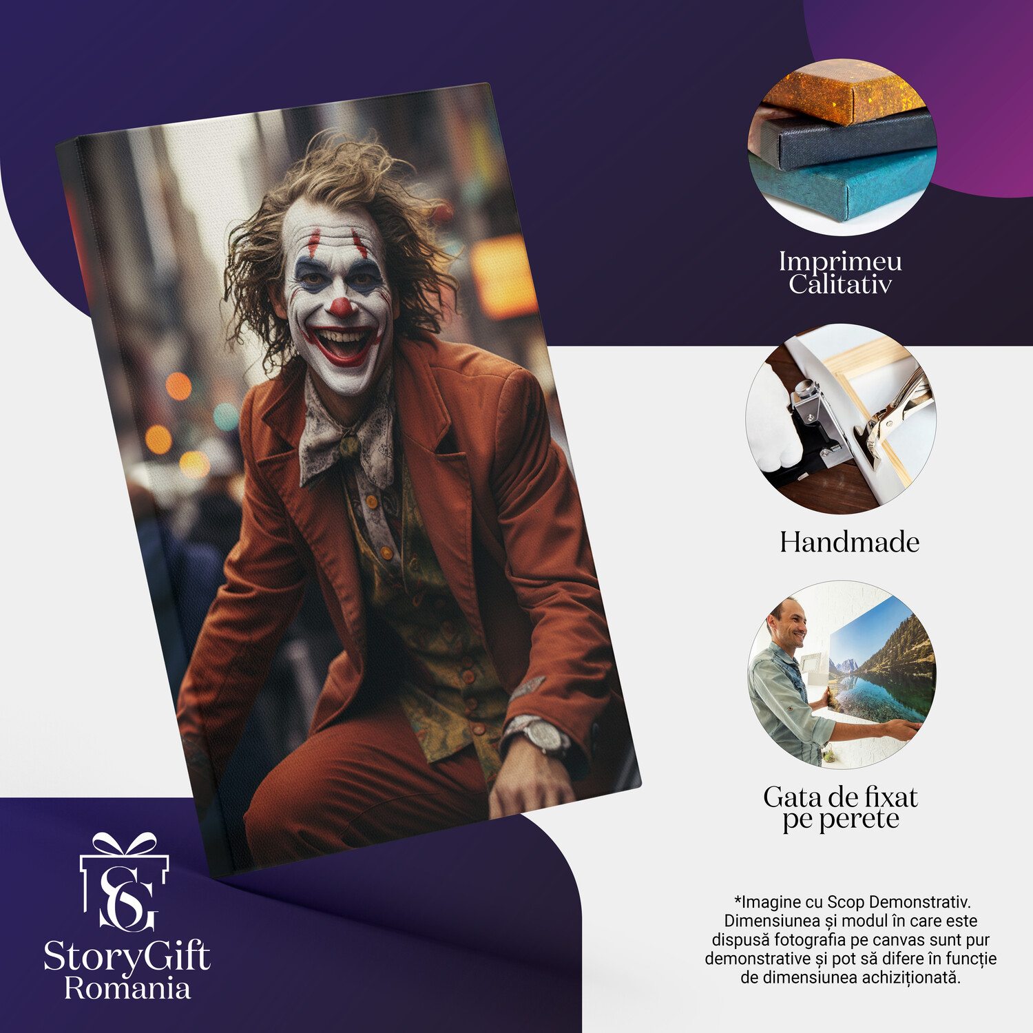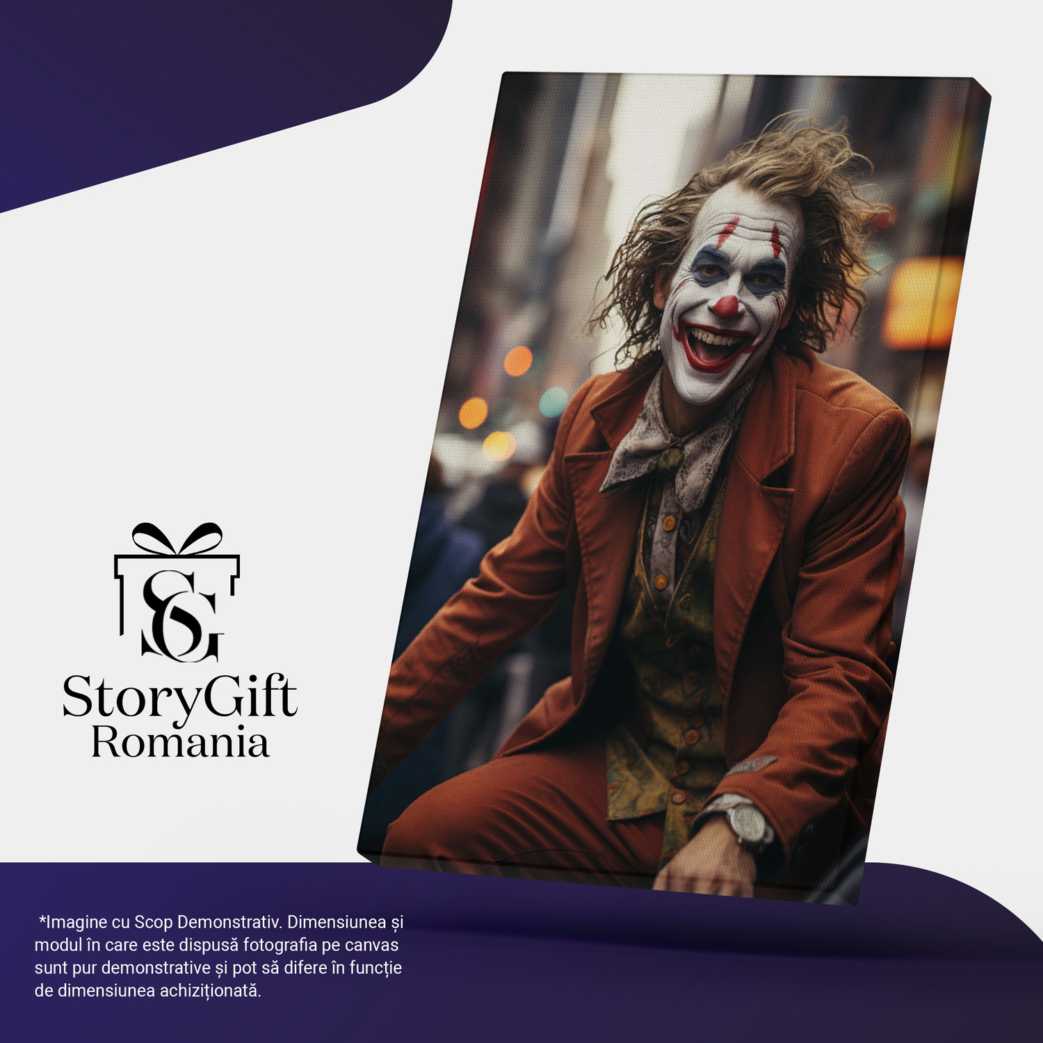 Tablou Canvas: Joker Barbat CU Par Verde Si Machiat Pe Fata pe strada printe oameni Desene Animate Pictura Digitala - Tablou Canvas Signature de la StoryGift Romania