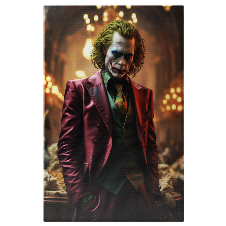 Tablou Canvas: Personajul Jocker cu Parul Vopsit si Fata Pictata in Costum si Vesta Verde cu Cravata Pictura Digitala 40x25CM