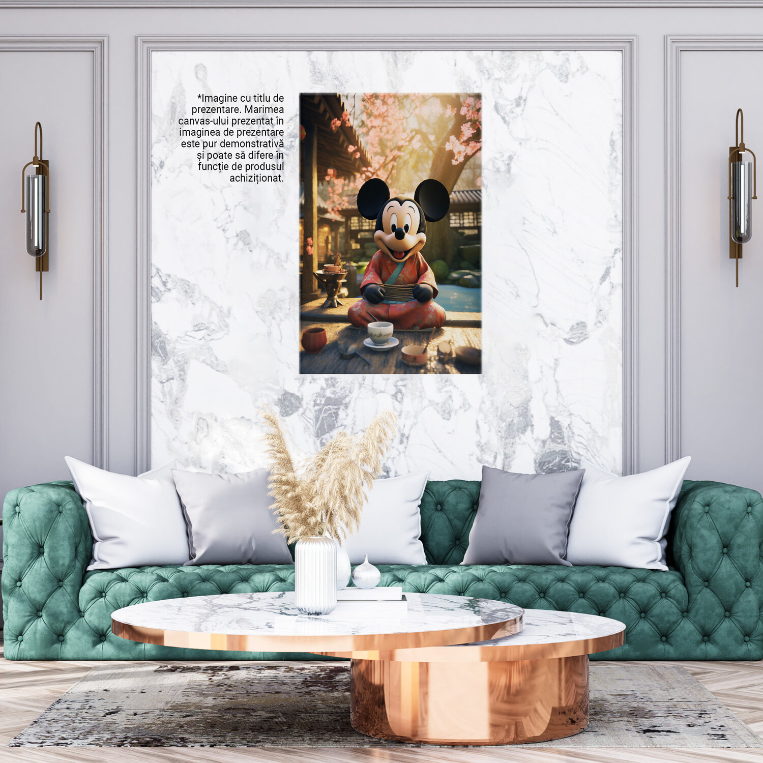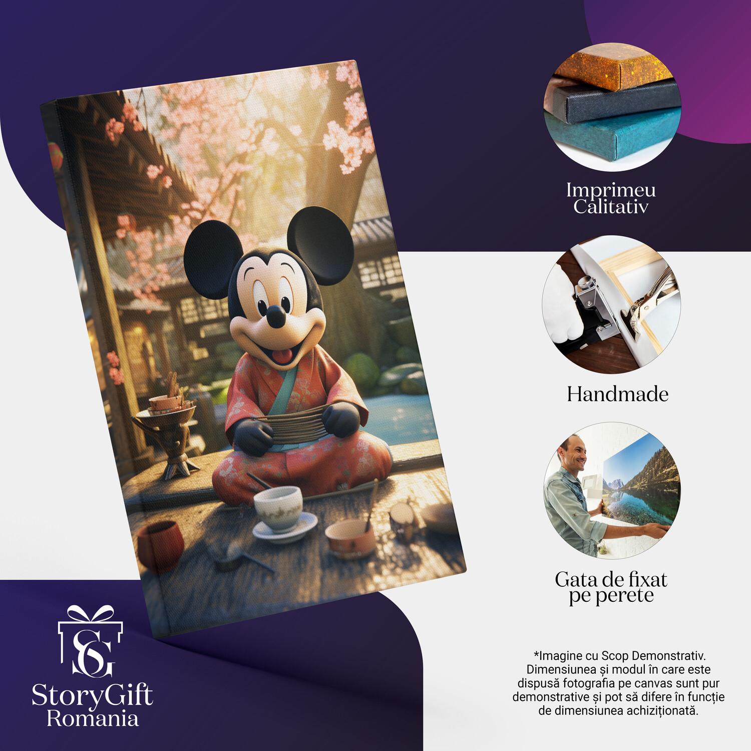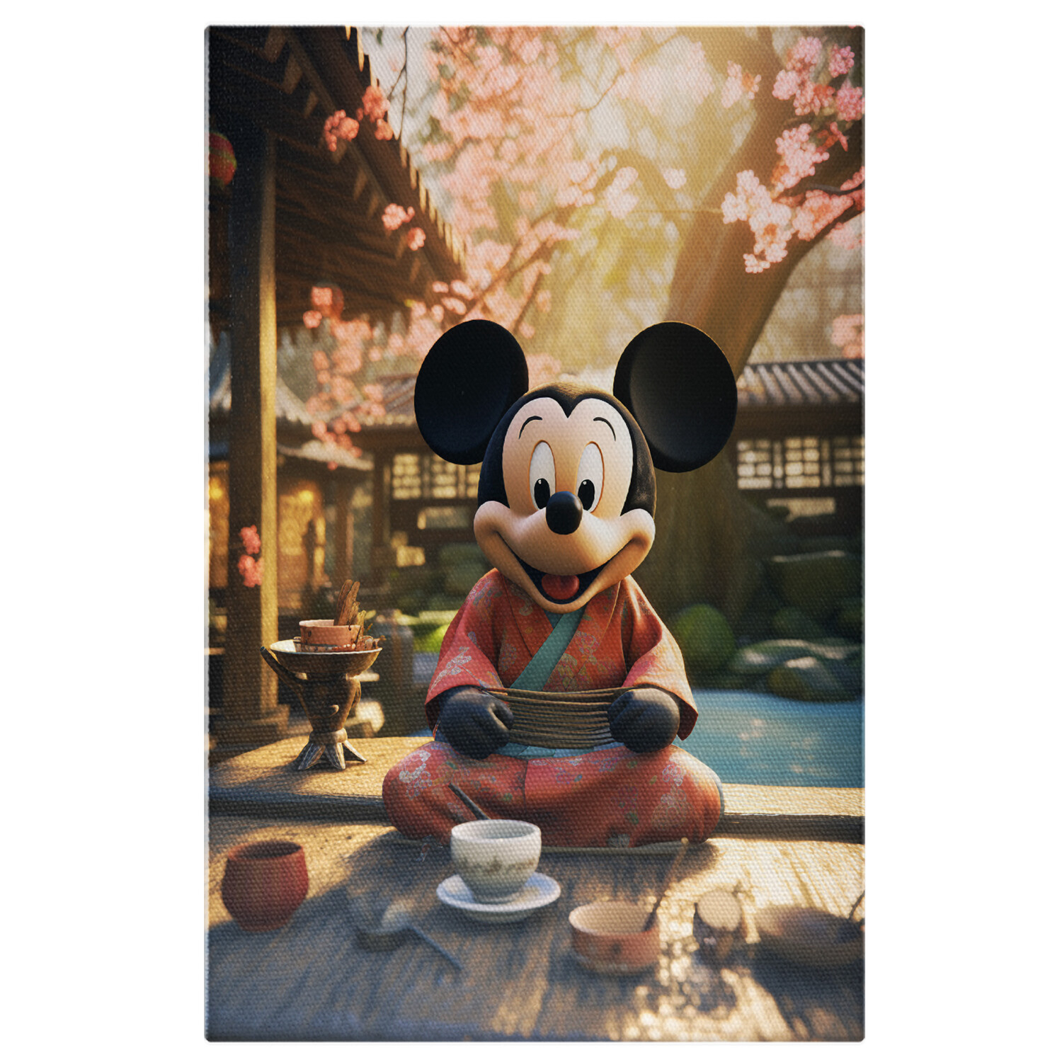 Tablou Canvas: Mickey Japonez care Bea Ceaiul in fata Templului langa Raul Micut si Relaxant Pictura Digitala - Tablou Canvas Signature de la StoryGift Romania