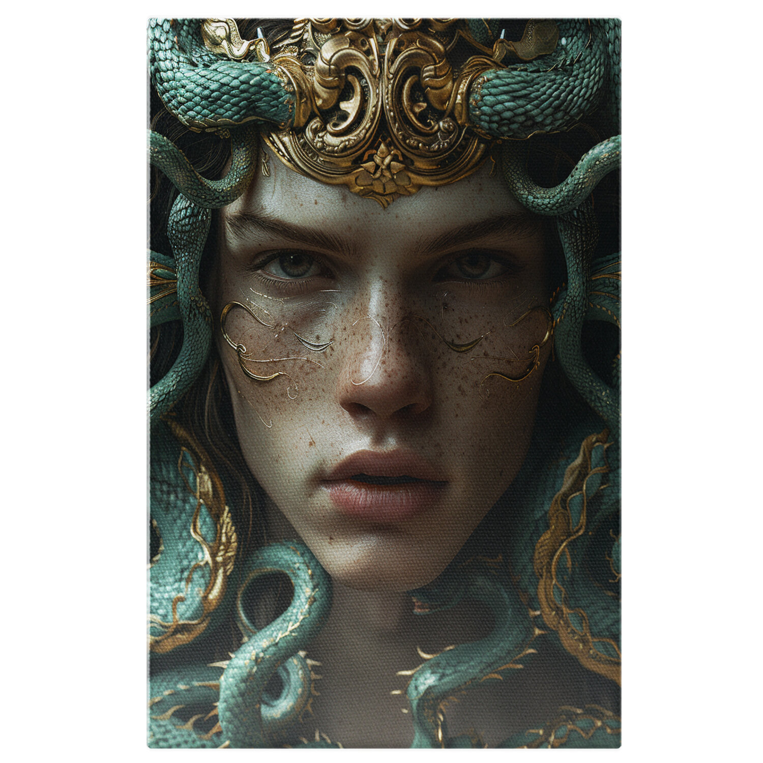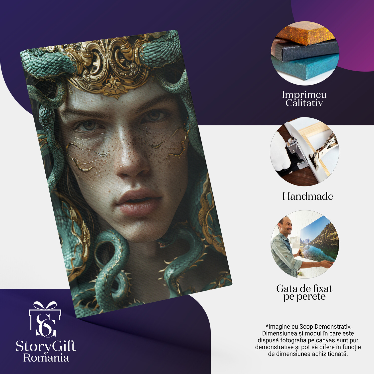 Tablou Canvas Personaj Masculin cu Ochii Stralucitori si Pistrui cu Modele de Serpi Albastri si Pistrui pe Chip , Pictura Digitala - Tablou Canvas Signature de la StoryGift Romania