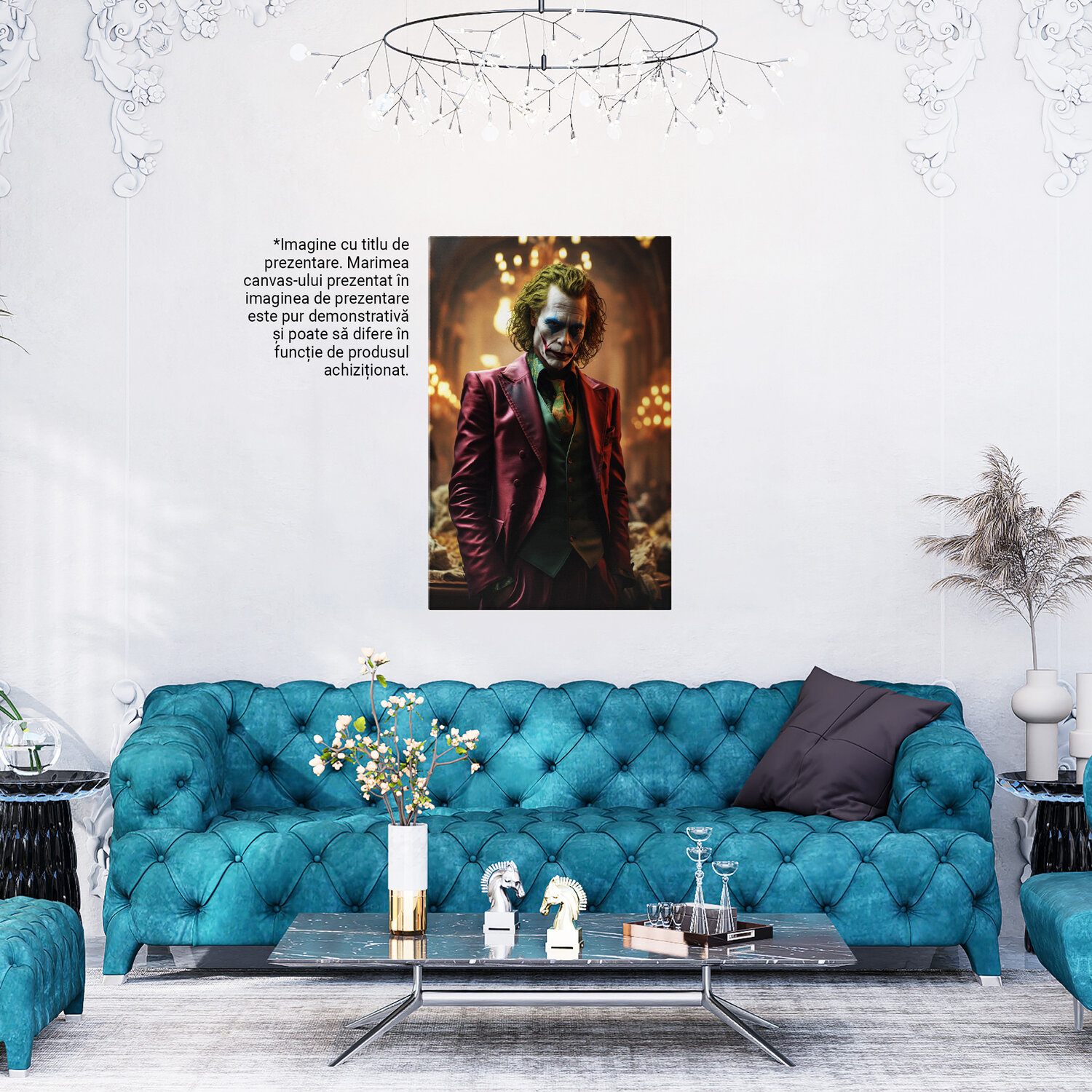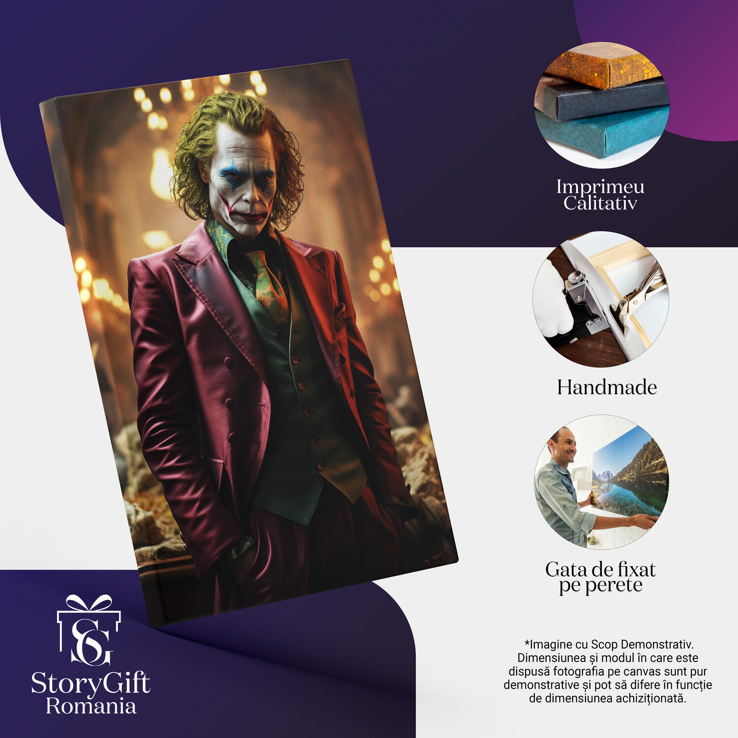 Tablou Canvas: Personajul Jocker cu Parul Vopsit si Fata Pictata in Costum si Vesta Verde cu Cravata Pictura Digitala - Tablou Canvas Signature de la StoryGift Romania
